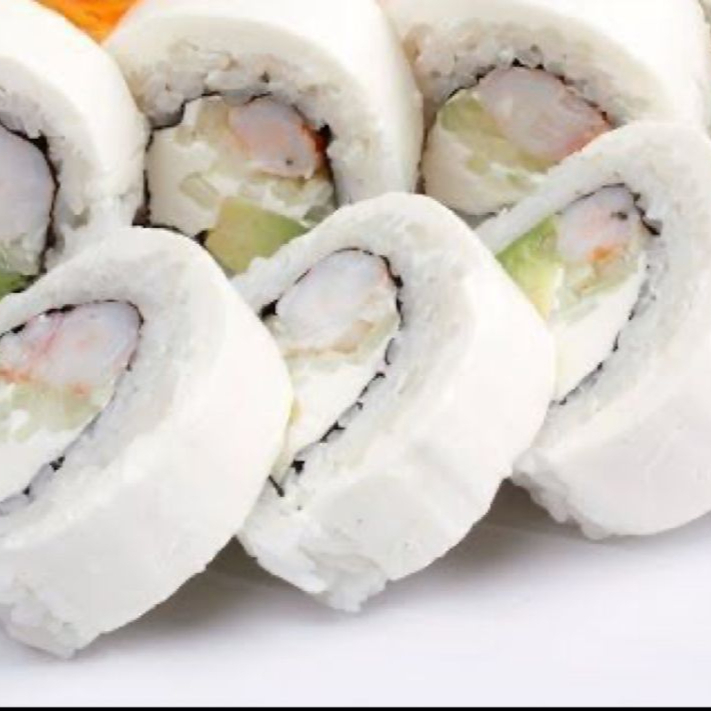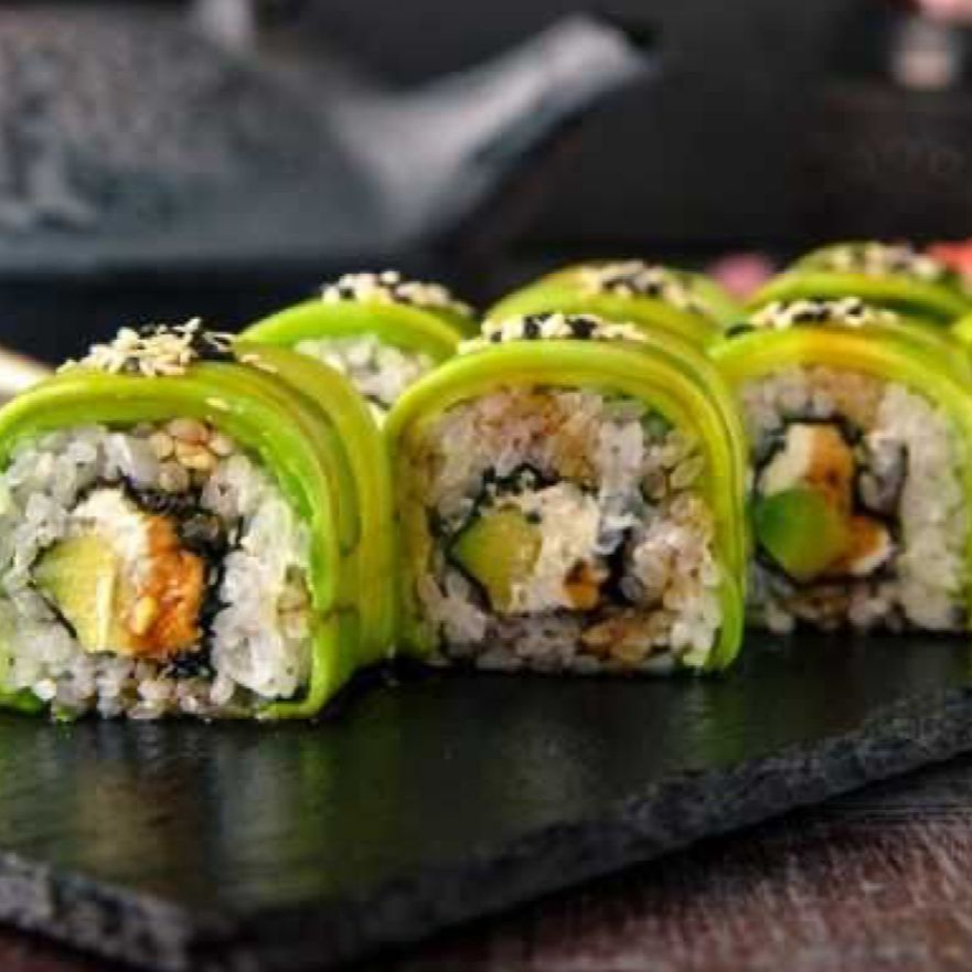 Rollo relleno de pepino, aguacate, philadelphia, camaron y forrado con una cama de philadelphia y aguacate rebanado