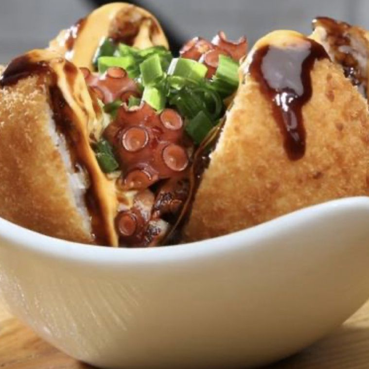Bola de arroz empanizada, con philadelphia, pepino, aguacate y camaron cocido,