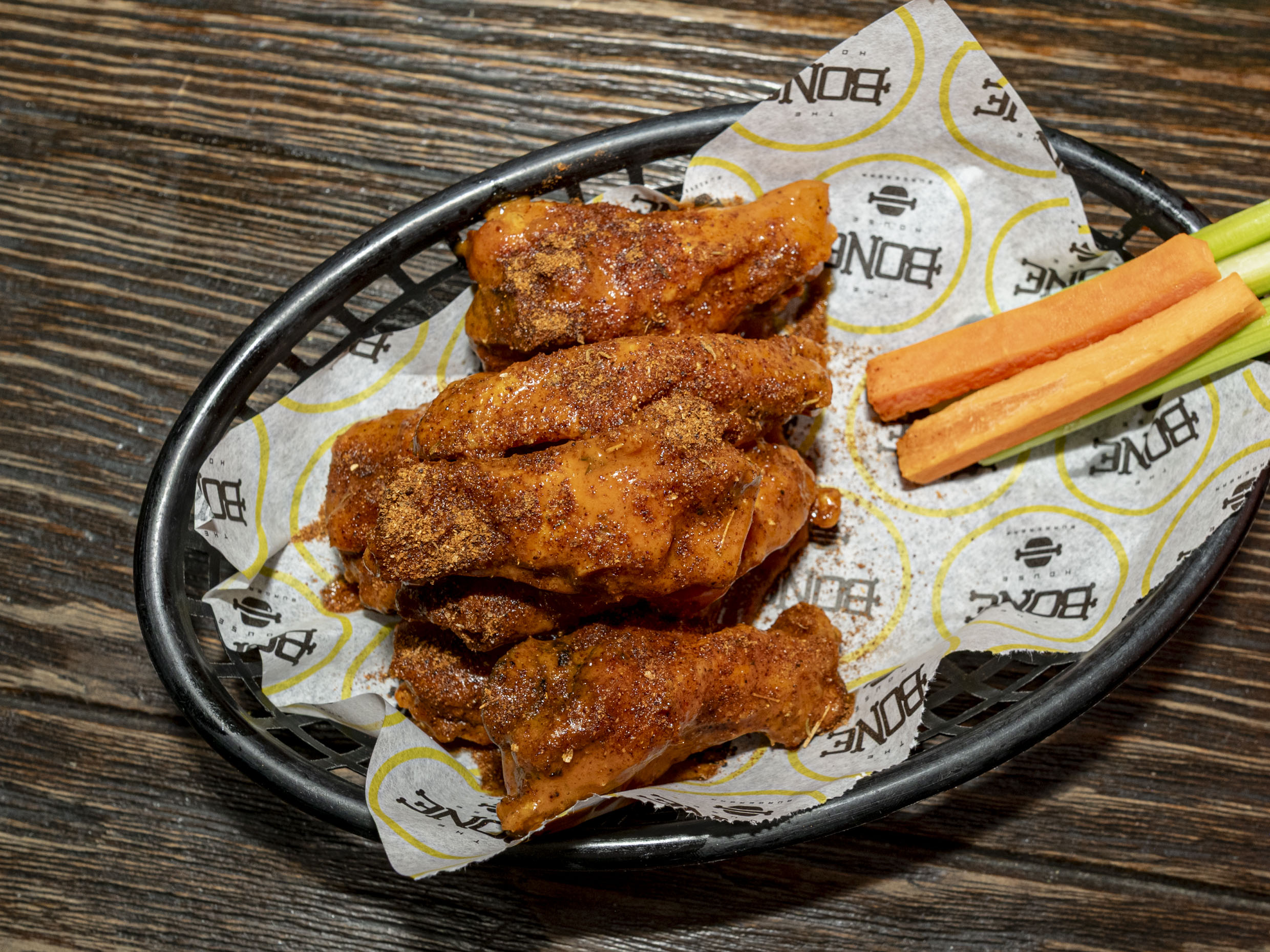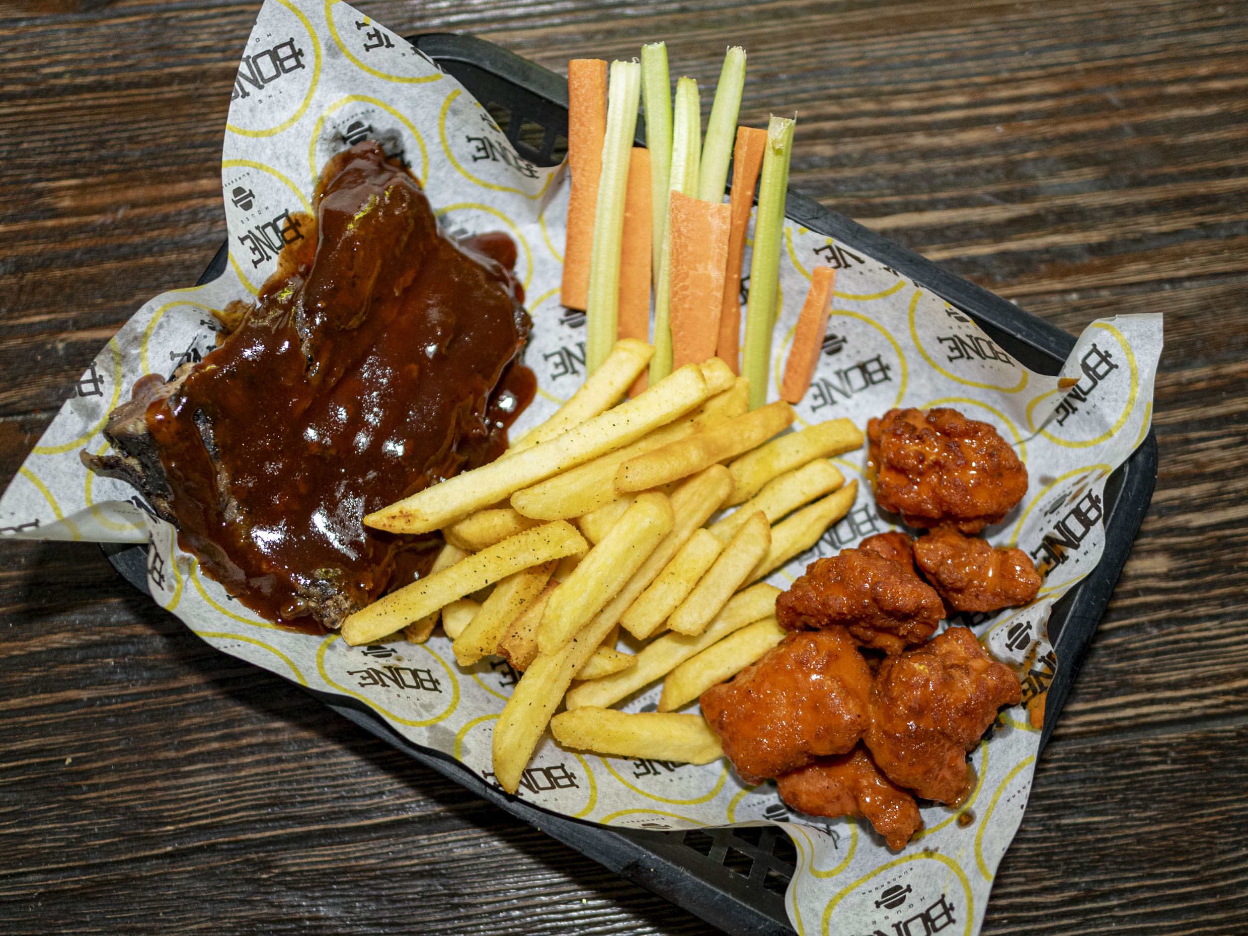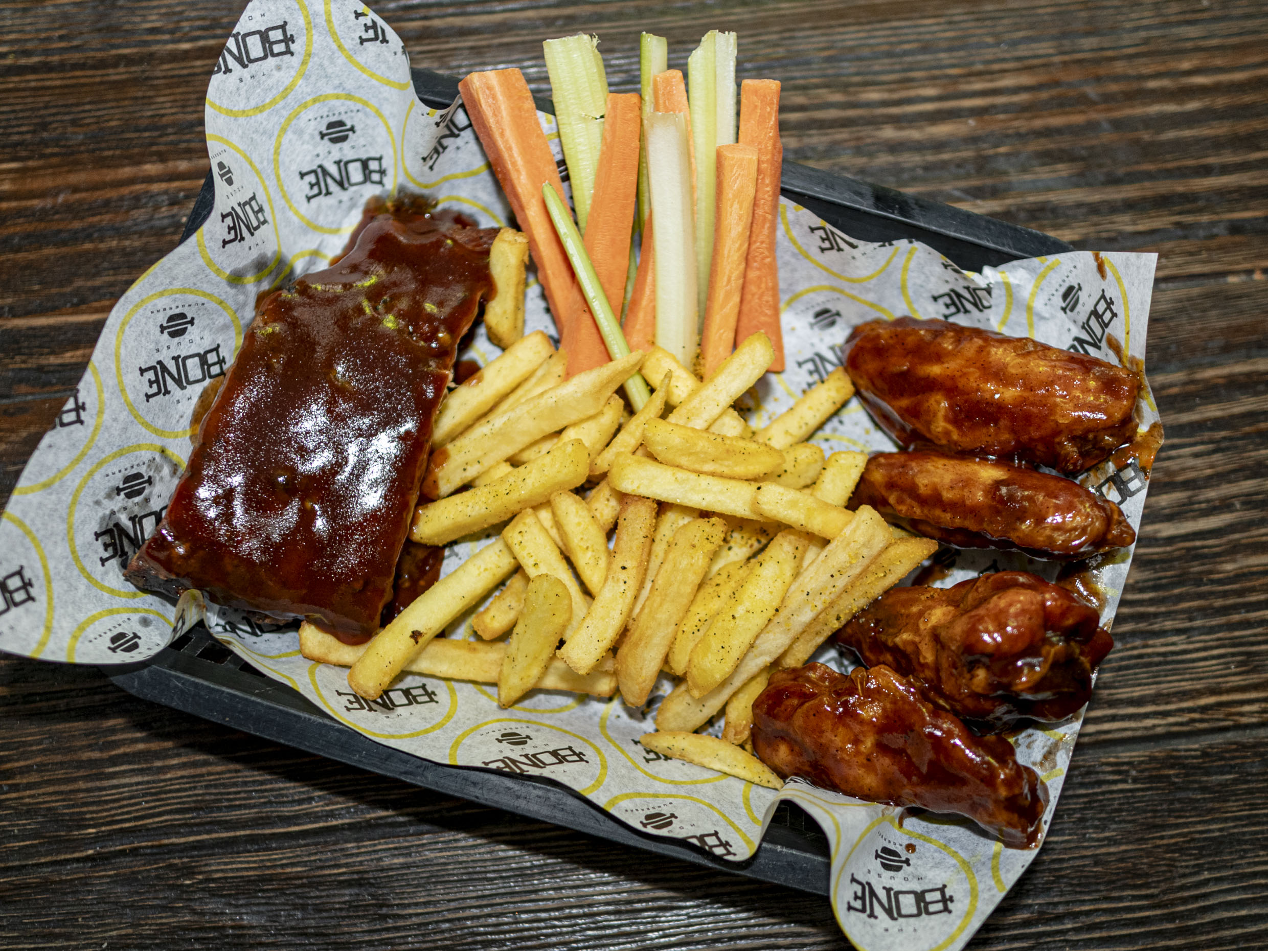 165 gr De costillas, 250 gr de alitas y 150 gr de papas a la francesa.