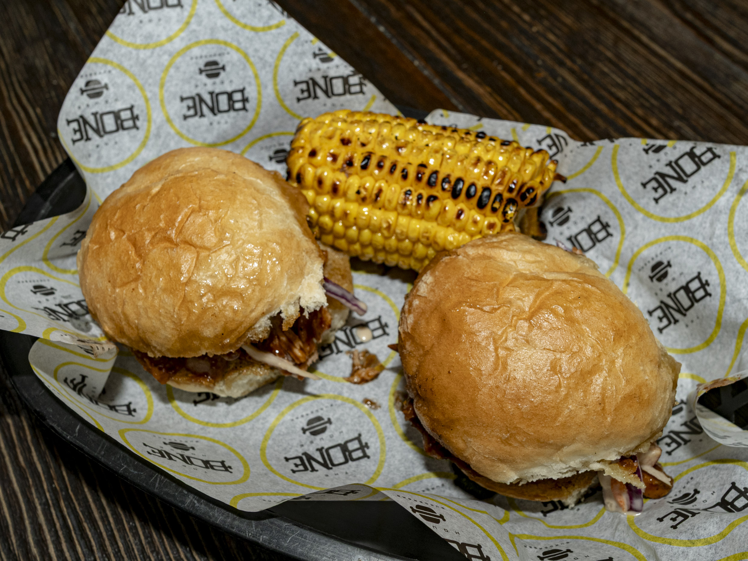 Orden de dos pequeños sandwiches de carne de cerdo ahumada bañada en salsa BBQ acompañado con elote amarillo. 100 gr.