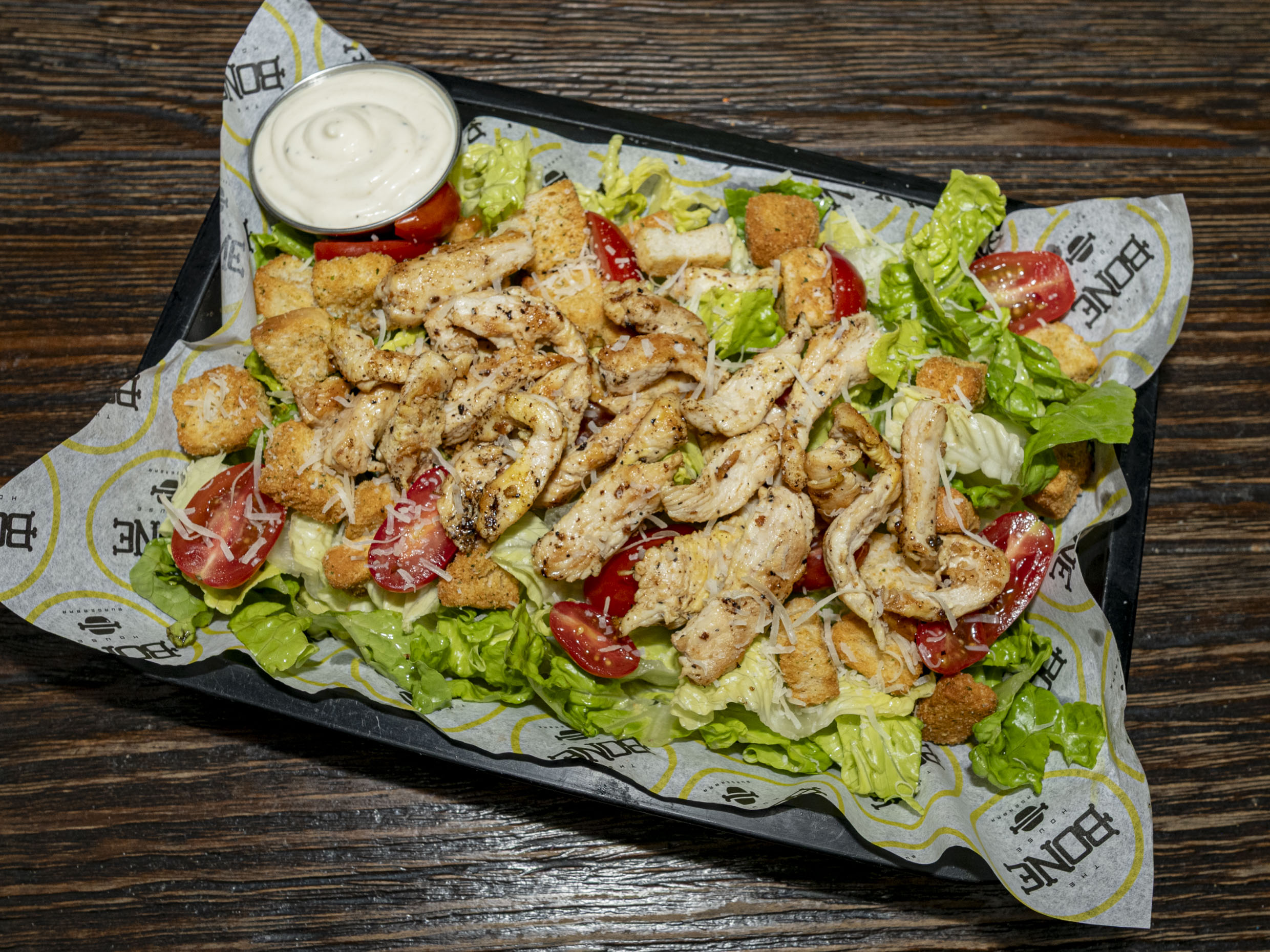 Base de lechuga, parmesano, tomate cherry, milanesa de pollo (crispy) crotones y aderezo cesar.