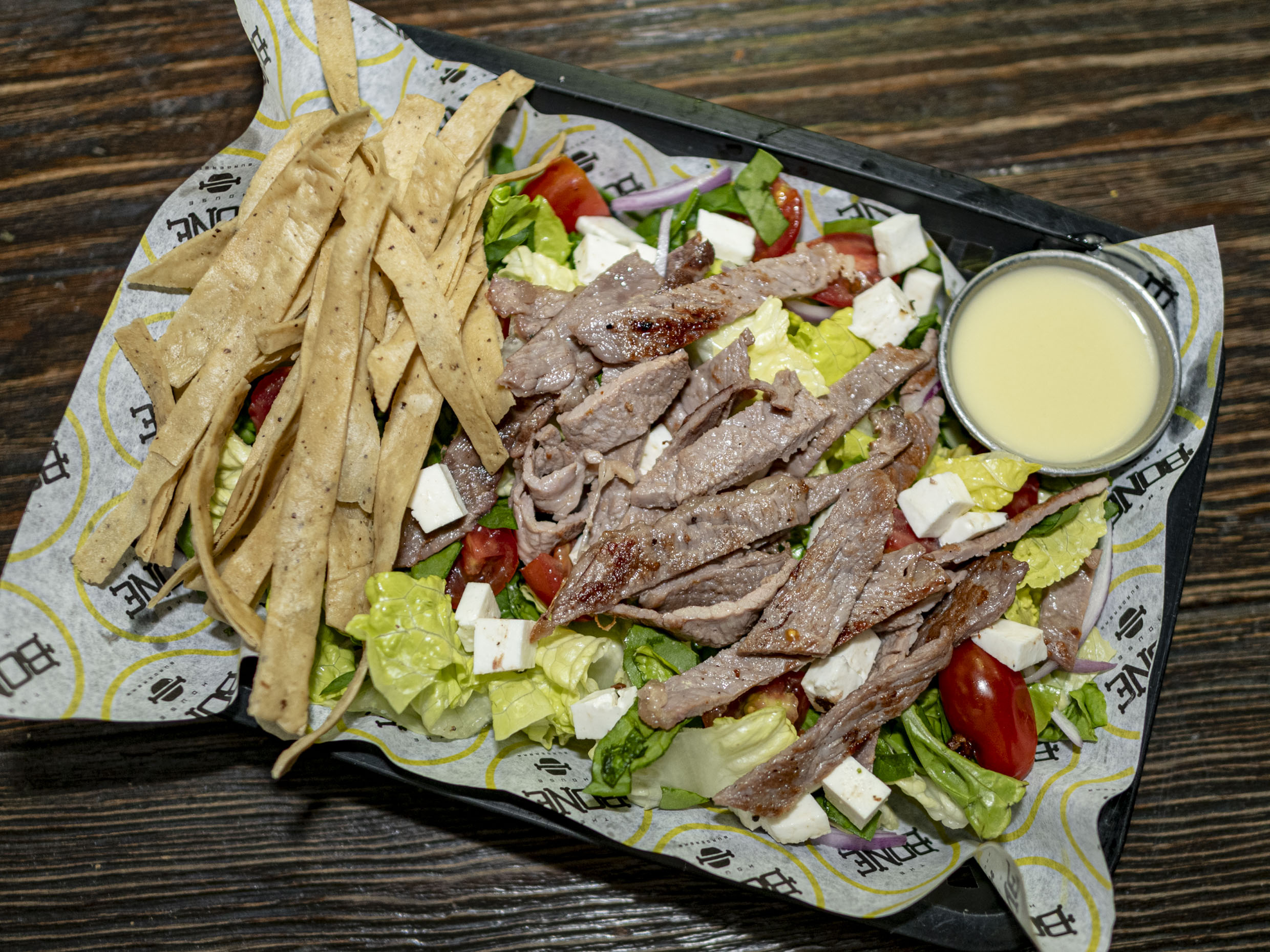 Base de lechuga, espinacas, acompañada de tomate cherry, panela, peinecillo y vinagreta de serrano.