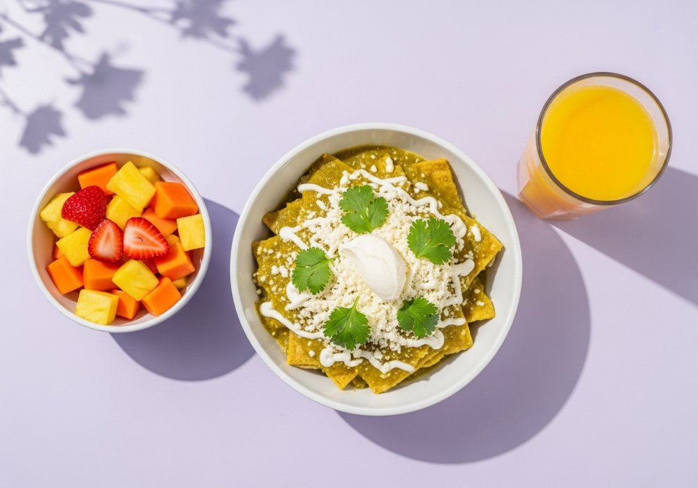 Celebra con nuestro combo especial: 1 Chilaquiles Verdes (Crema, queso,cebolla y cilantro), una porción de fruta(fresa, papaya y piña) y un jugo de naranja.