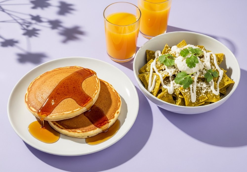 Celebra con nuestro combo especial para compartir que incluye: 1 Pancakes tradicionales, 1 Chilaquiles Verdes y un jugo de naranja. ¡El equilibrio perfecto entre dulce y salado!