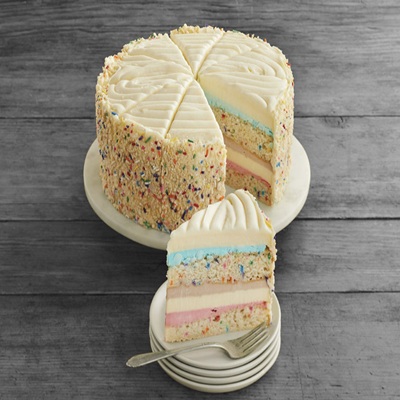 Capas de cheesecake, pastel, mousse de fresa, chocolate y vainilla, con frosting de queso crema.