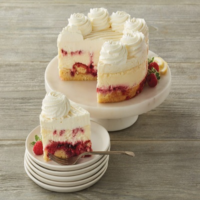 Pastel de frambuesa y vainilla, cremoso cheesecake y mousse de limón amarillo en una base de galletas con frambuesa.