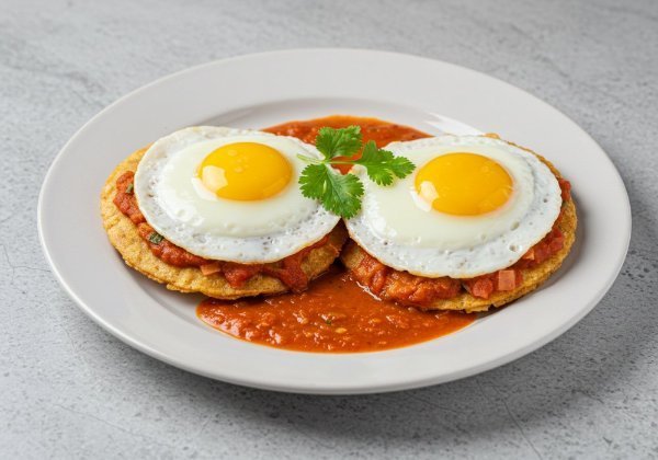 Huevos estrellados con su yema suave, cubiertos de salsa roja y montados sobre tortillas fritas doradas.