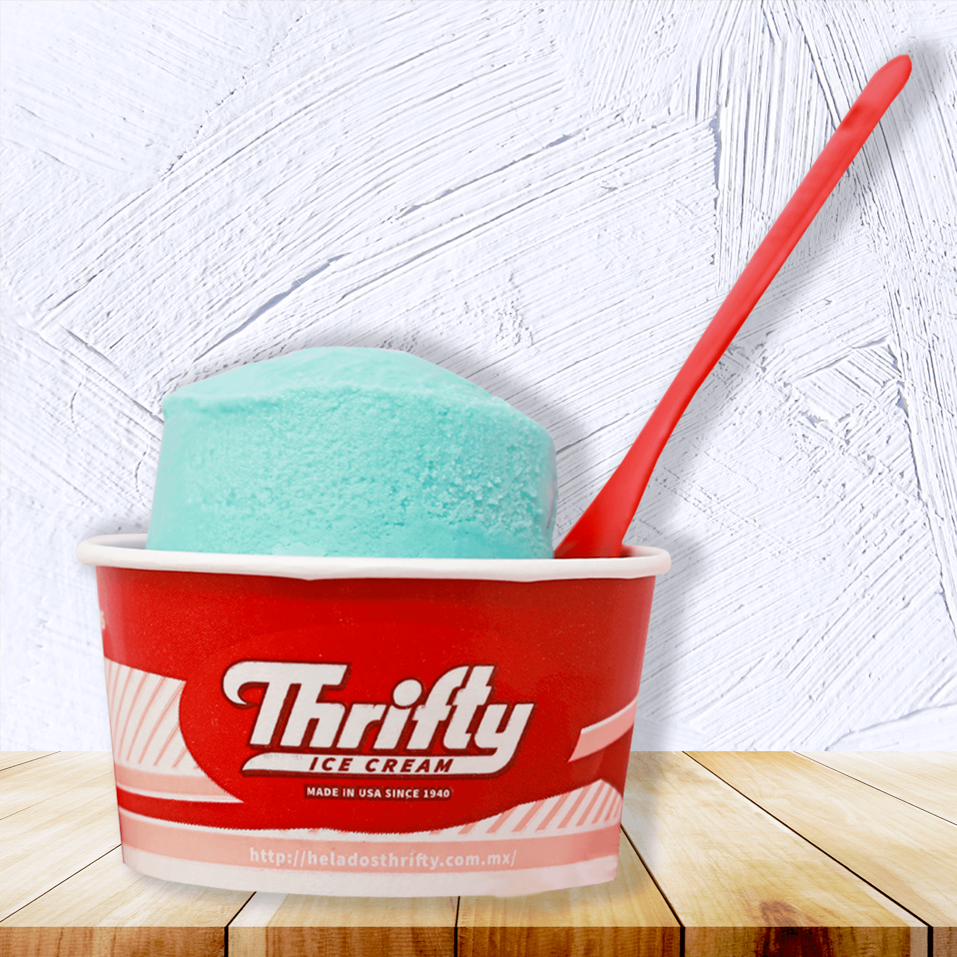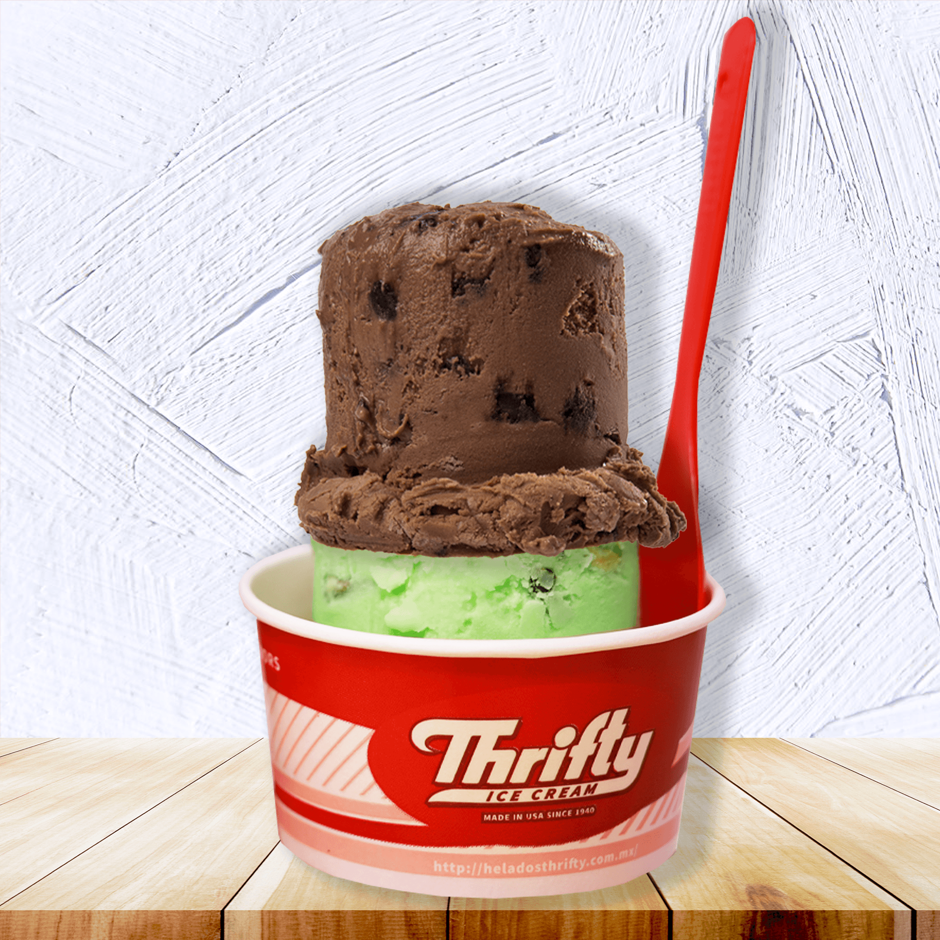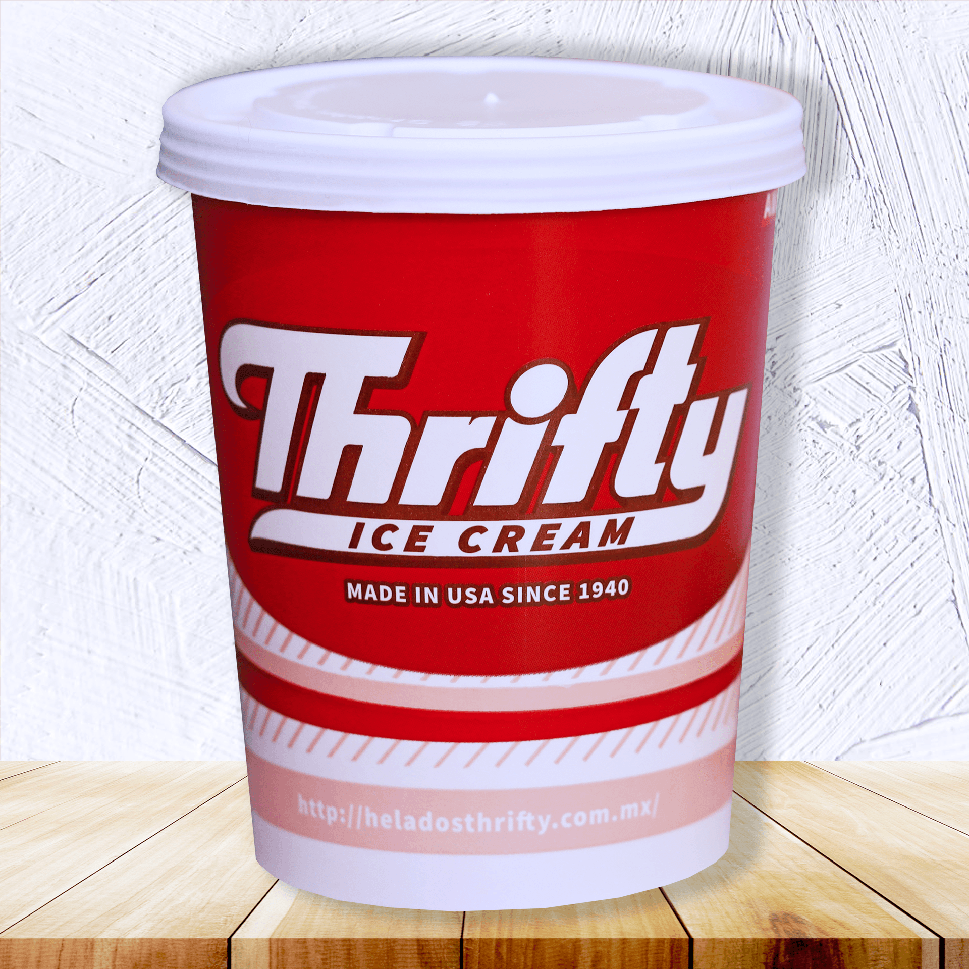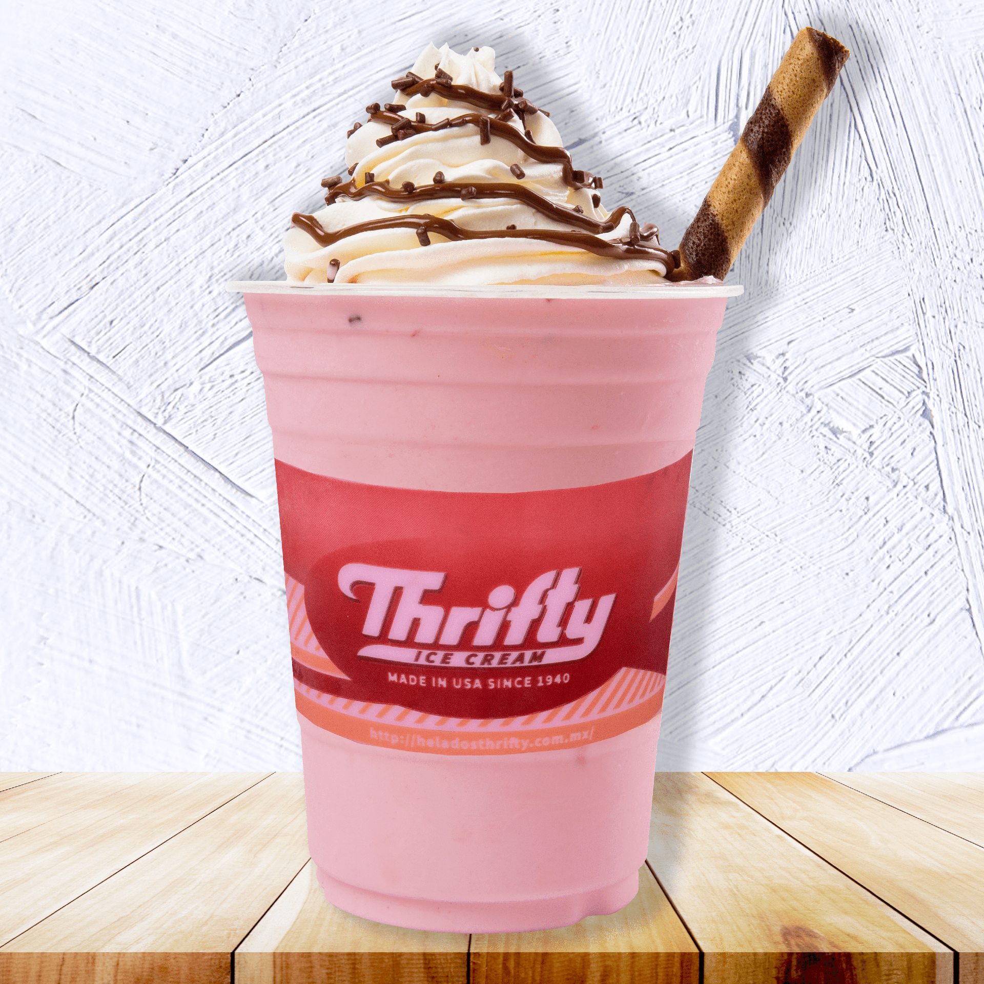 2 porciones de helados servidas con scooper thrifty de leche, crema chantilly, 1 galleta clásica y popote en vaso de 16oz thrifty