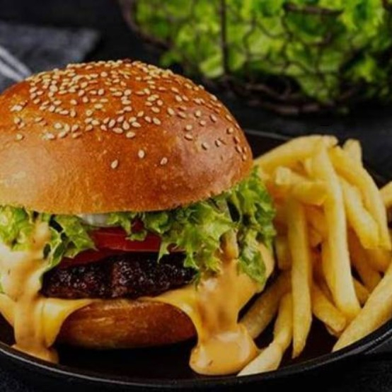 Hamburguesa con doble carne, tocino, queso amarillo, aros de cebolla con un baño de salsa ahumada de BBQ más chile jalapeño.