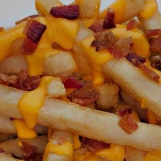 Papas a la francesa bañadas en queso gratinado acompañadas con un toque de bites de tocino.
