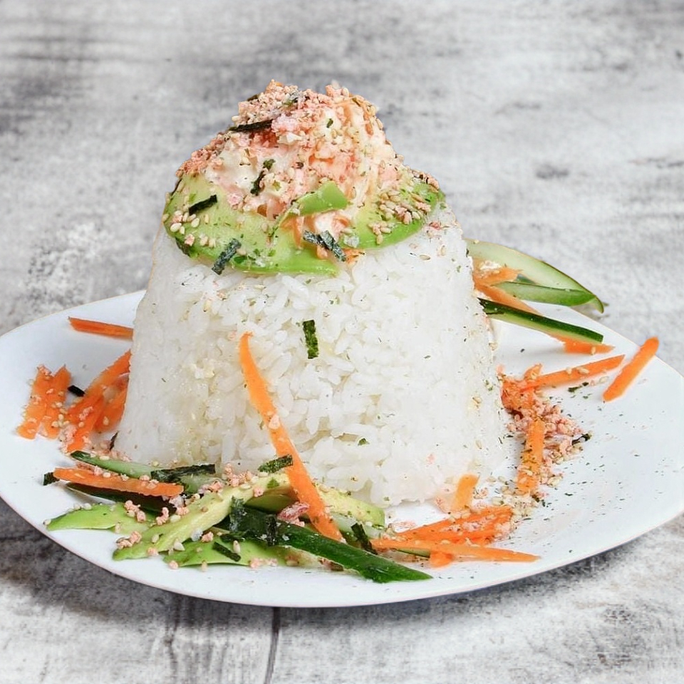 Arroz al vapor con camarones, tocino, philadelphia, aguacate y salsa de anguila y ensalada kani