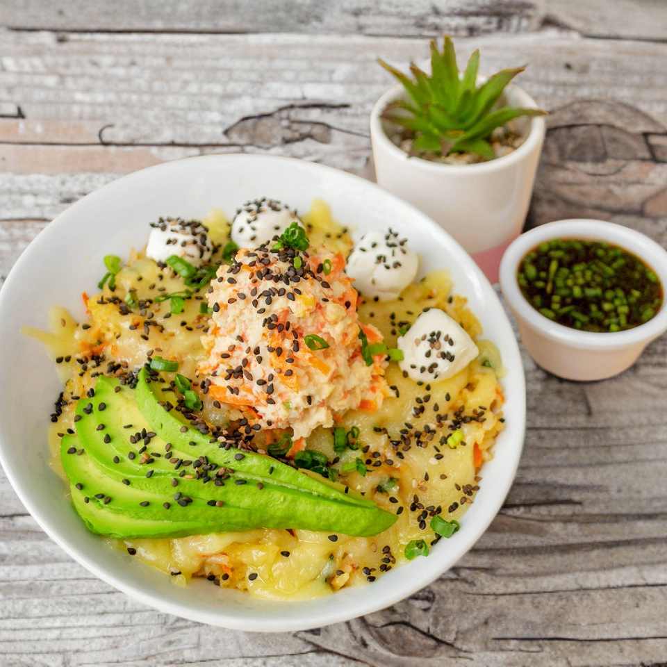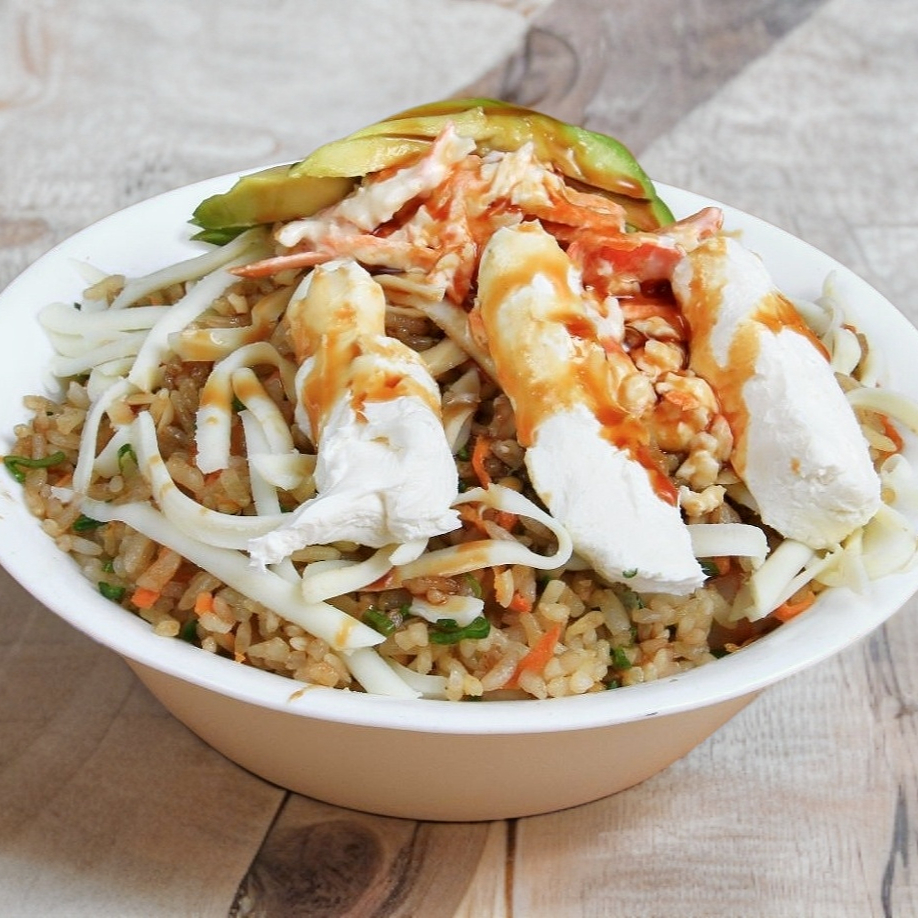 Arroz frito con pollo empanizado, filadelfia, ensalada de surimi y aguacate .
