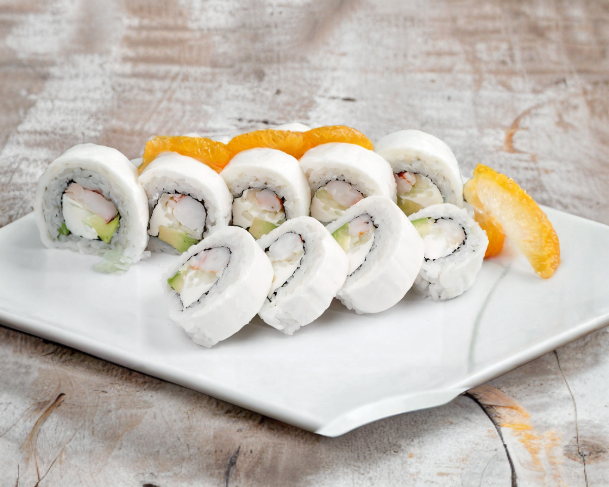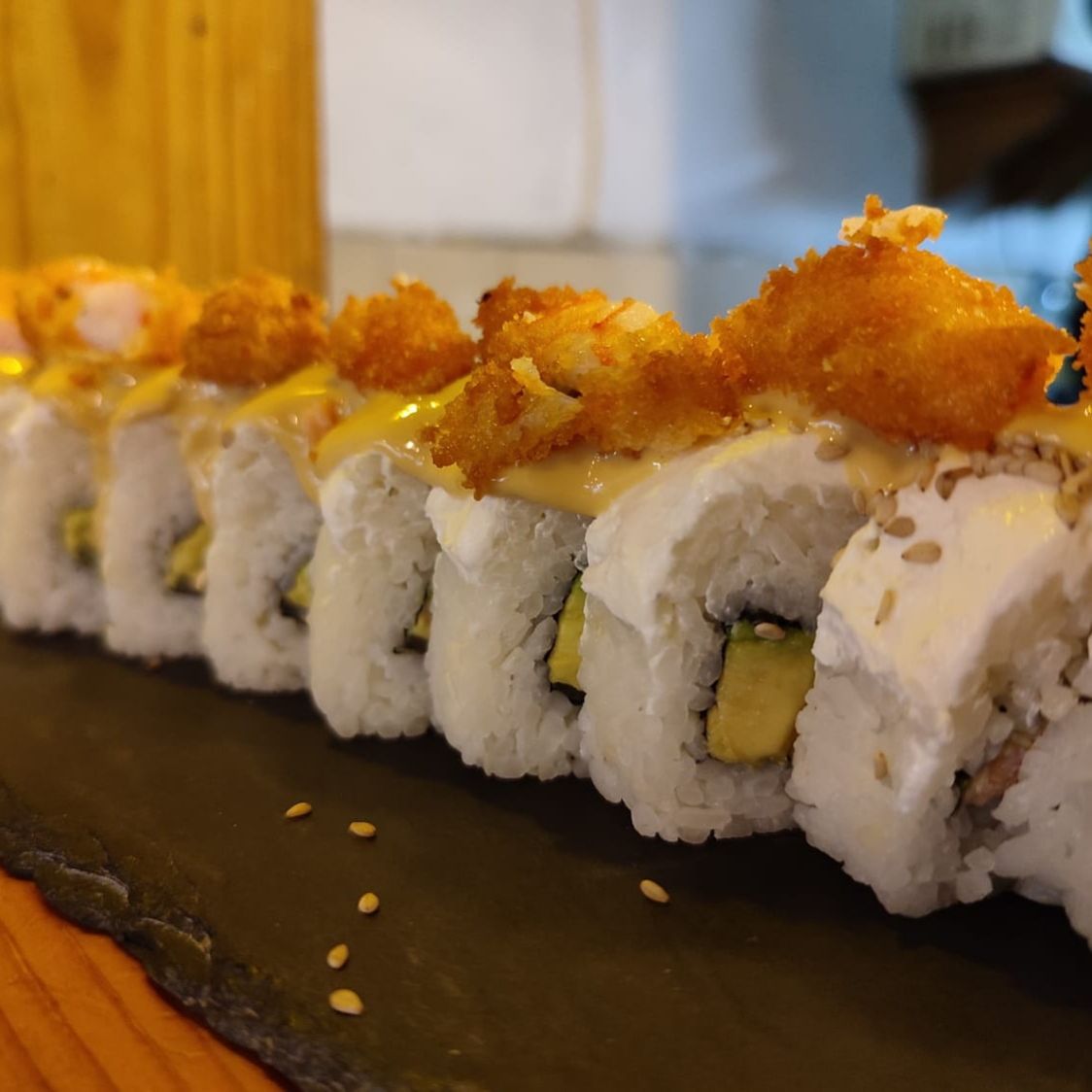 Queso philadelphia, aguacate y camarones por fuera, surimi y pepino por dentro, coronado con kani y salsa de anguila, espolvoreado con ajonjolí negro