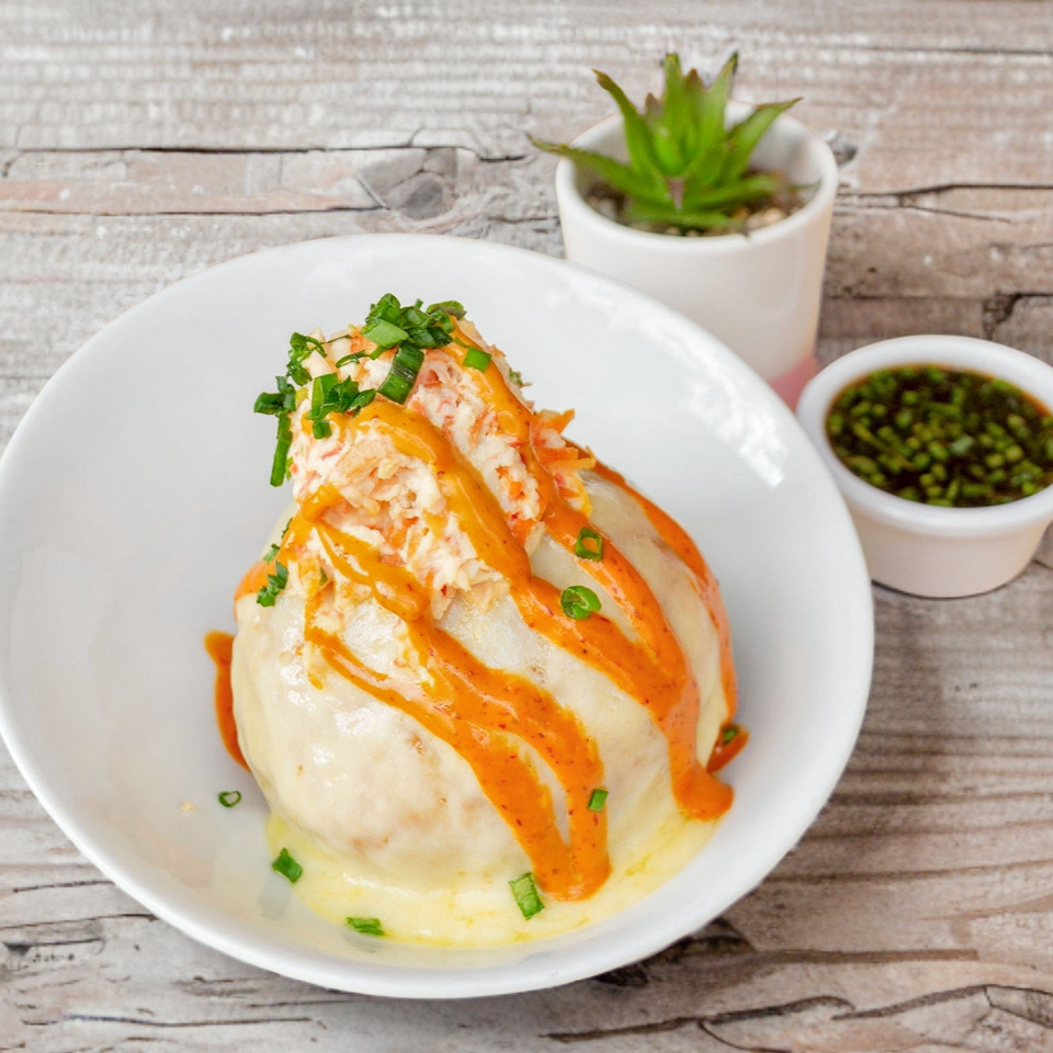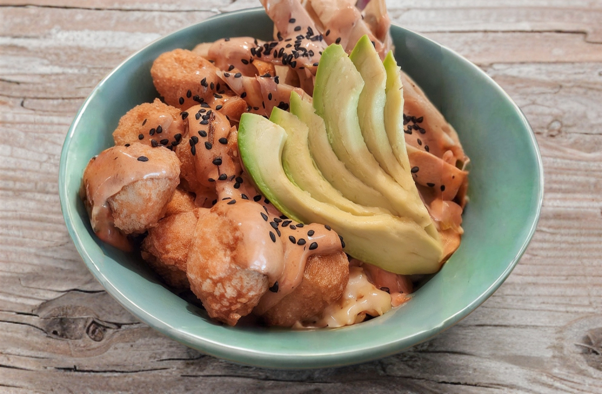 Bola de arroz empanizada con camarón, philadelphia, pepino, aguacate, por dentro cubierta de queso gouda fundido, ensalada de surimi, chipotle y ajonjolí negro