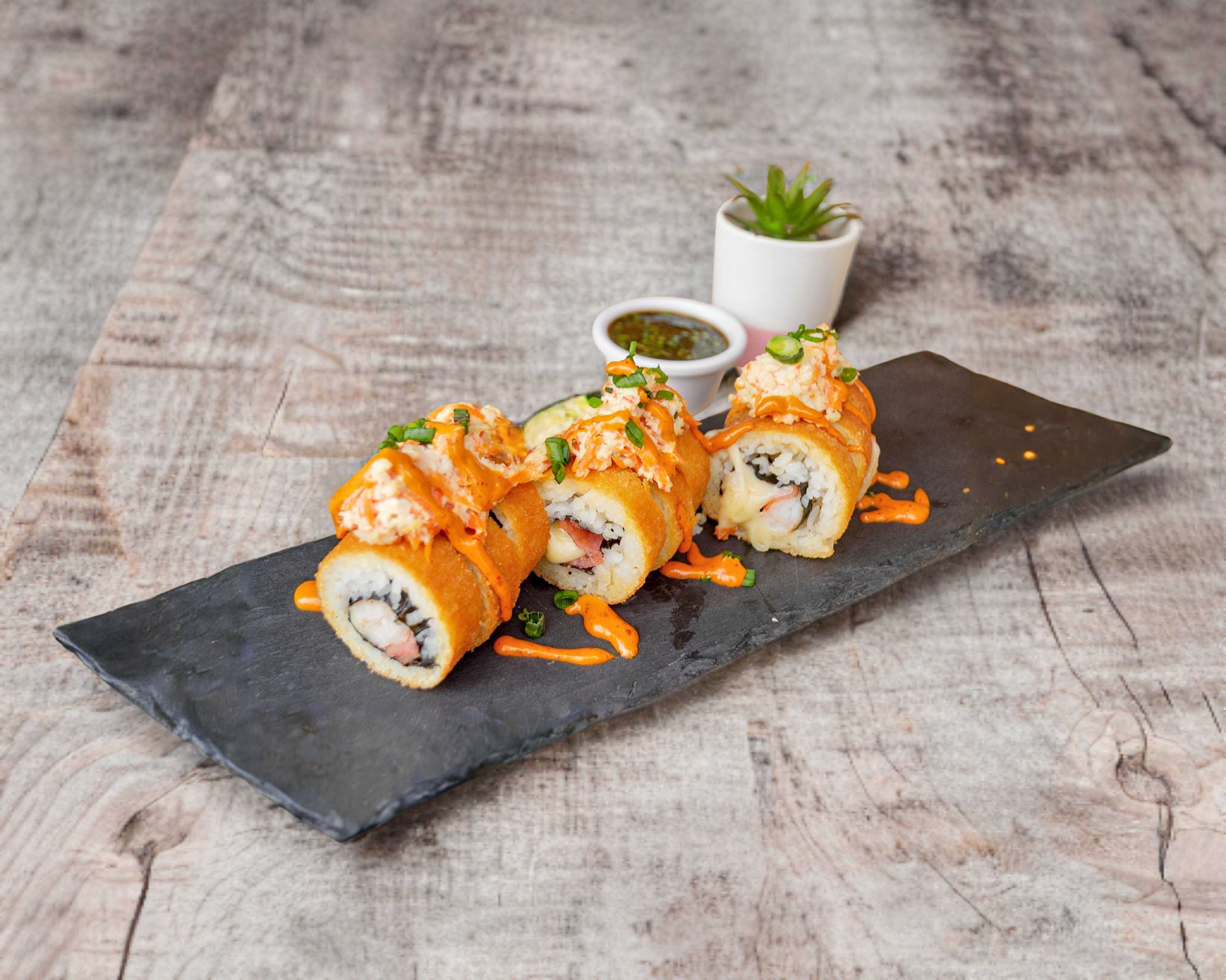Camarón, pepino, philadelphia por dentro, gouda por fuera, empanizado con aderezo de chipotle