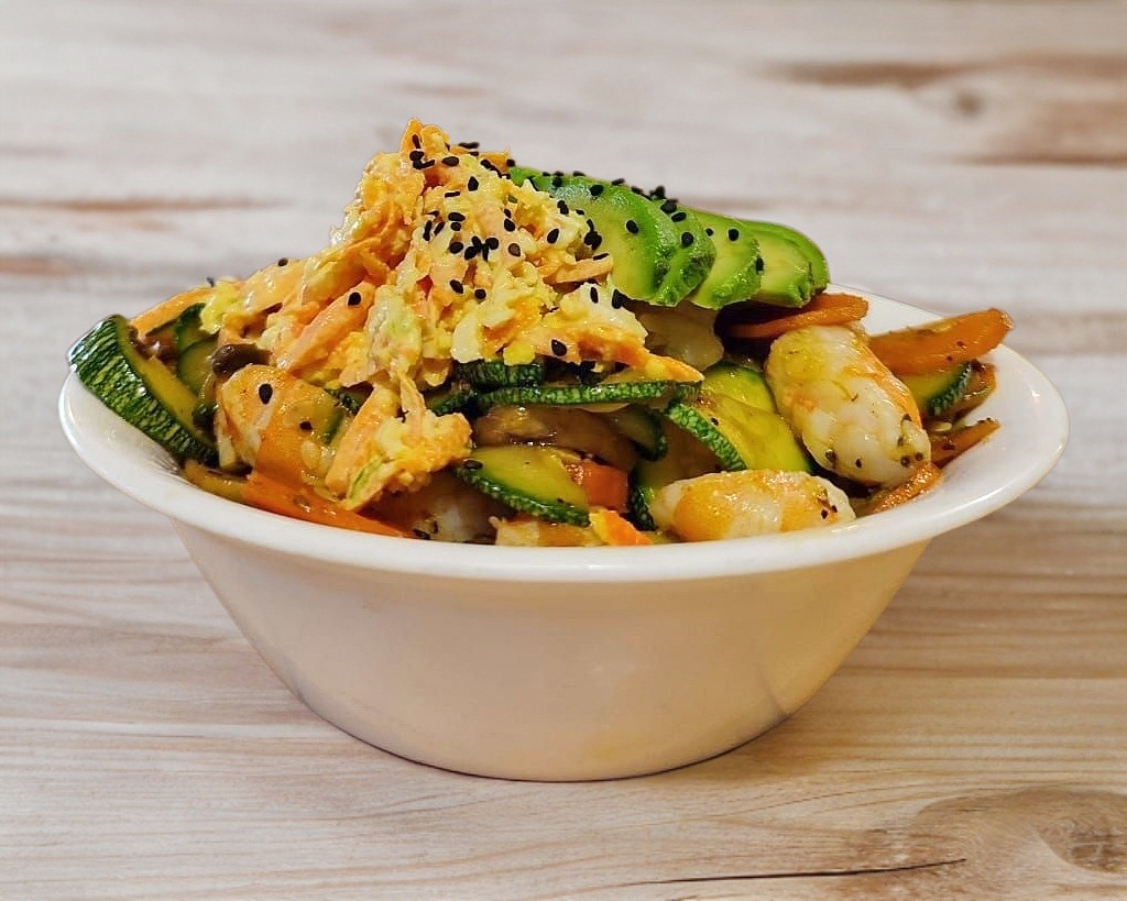 Arroz frito con camarones al ajillo salteados a la plancha, ensalada de surimi, philadelphia y aguacate