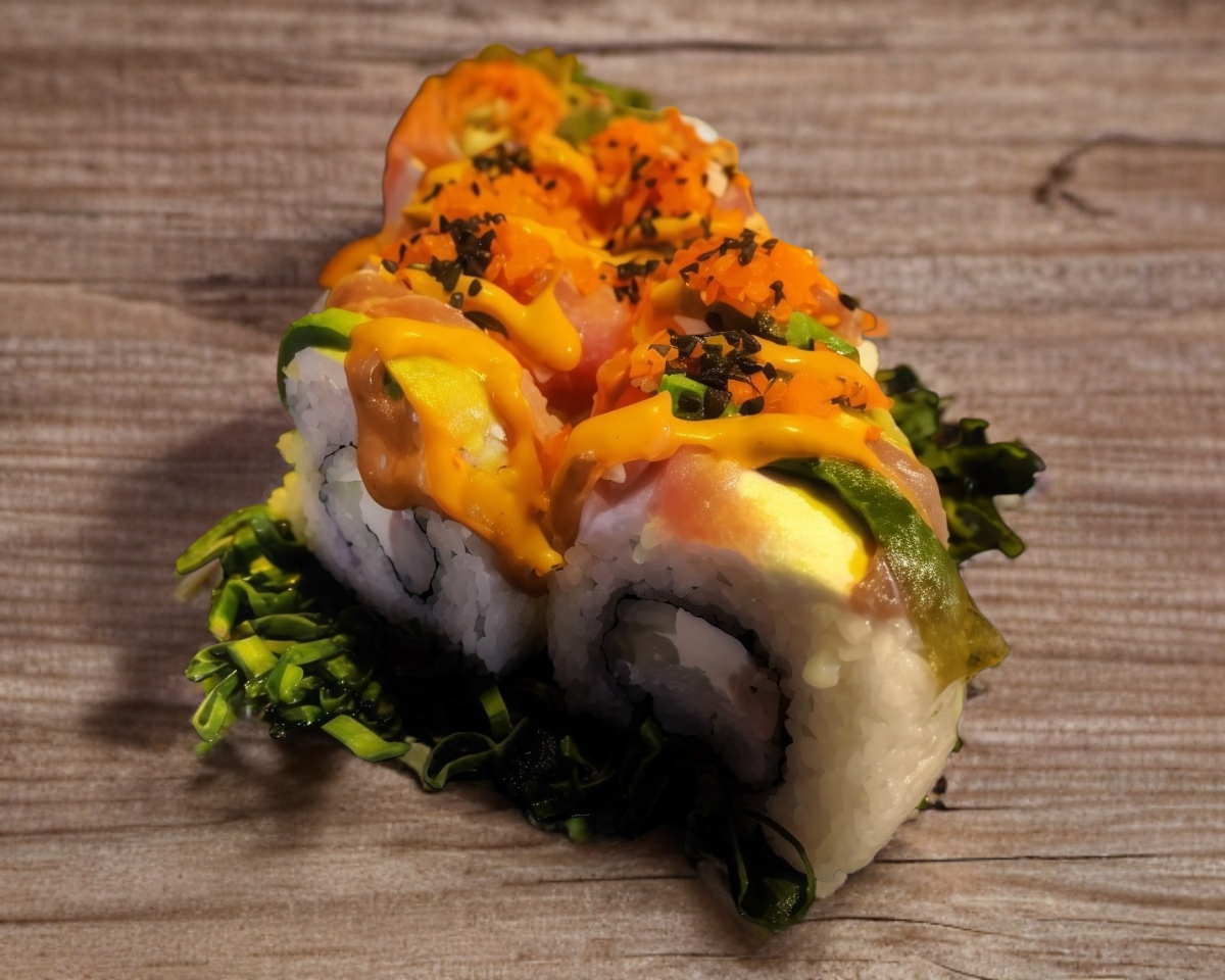 Camarones empanizados, queso gouda y tocino por dentro, philadelphia, aguacate y surimi por fuera, coronado con kani y bañado en salsa de anguila