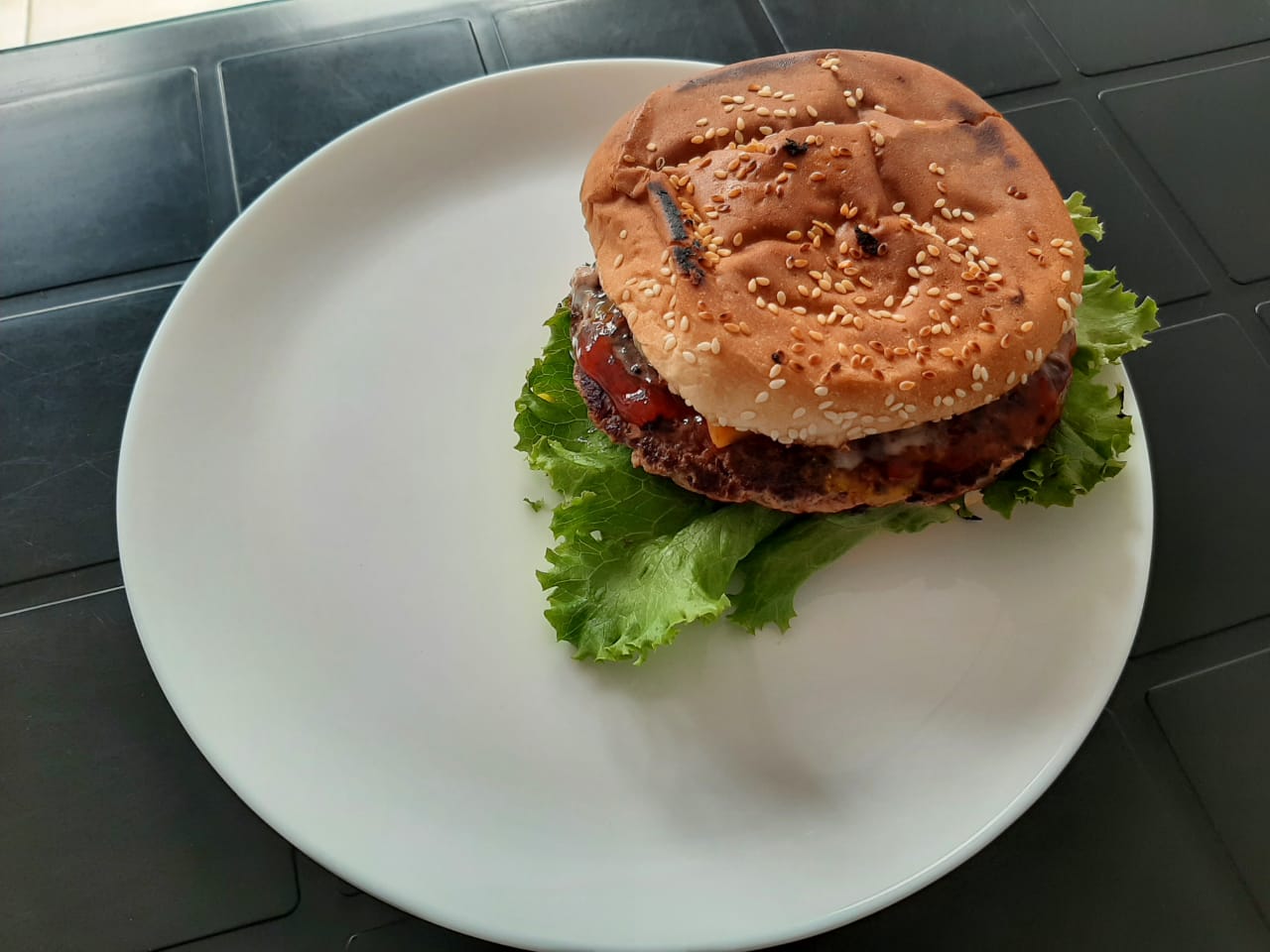 HAMBURGUESA GRANDE/RES CON TROCITOS DE ARRACHERA