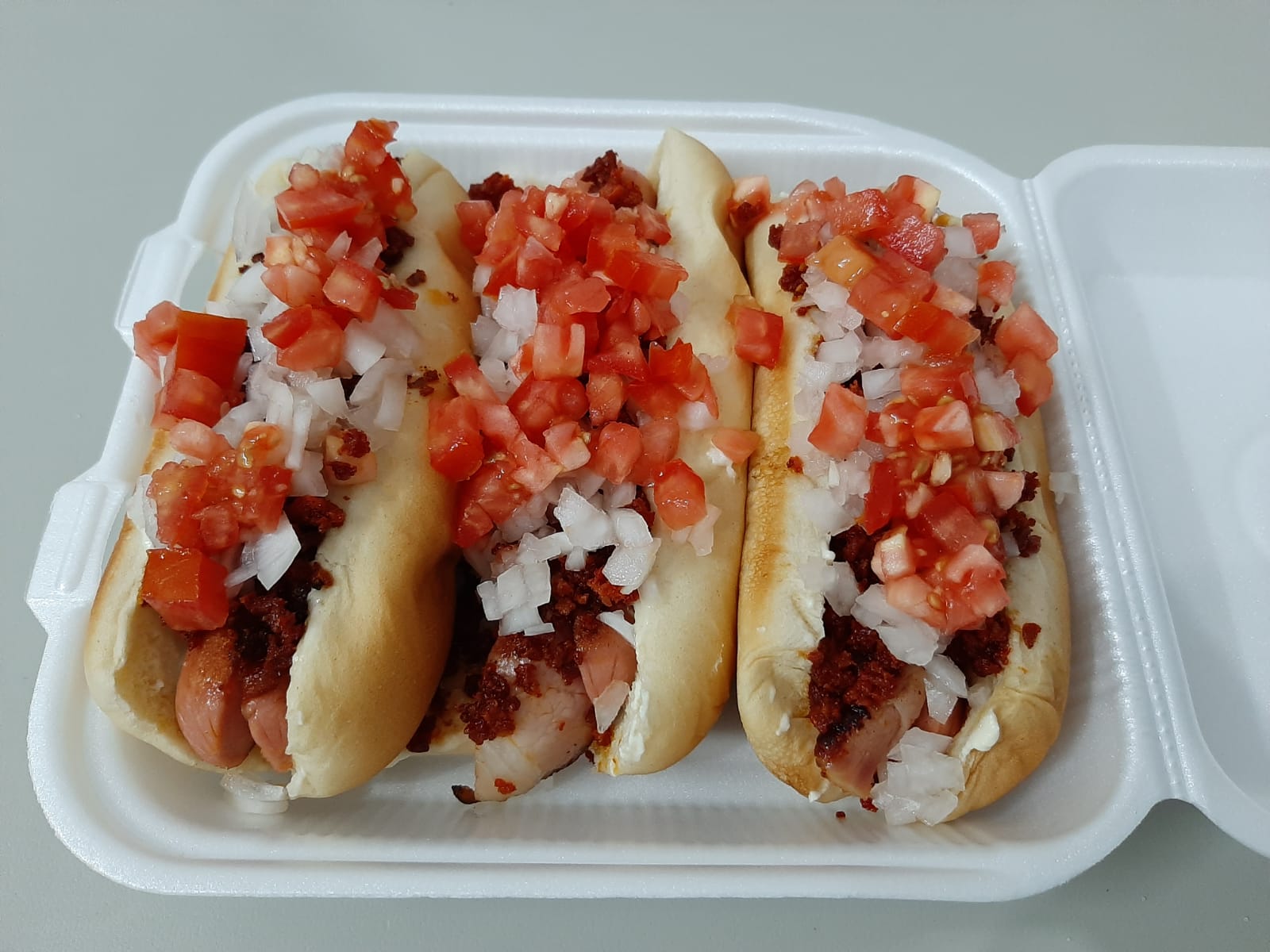 Salchicha de pavo, con tocino, jitomate y cebolla picado, crema,mostaza y salsa cátsup.