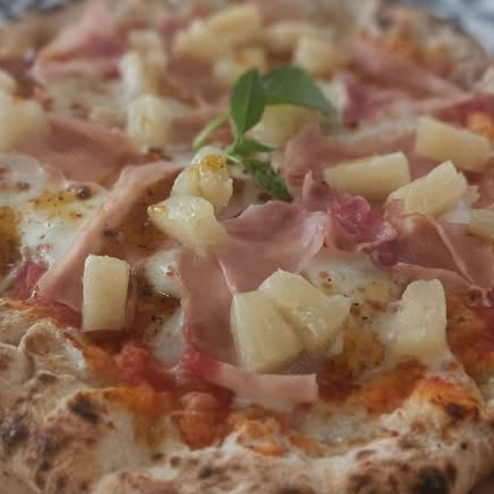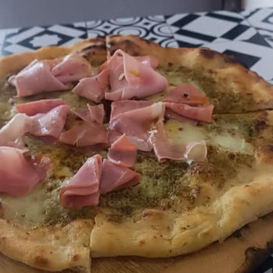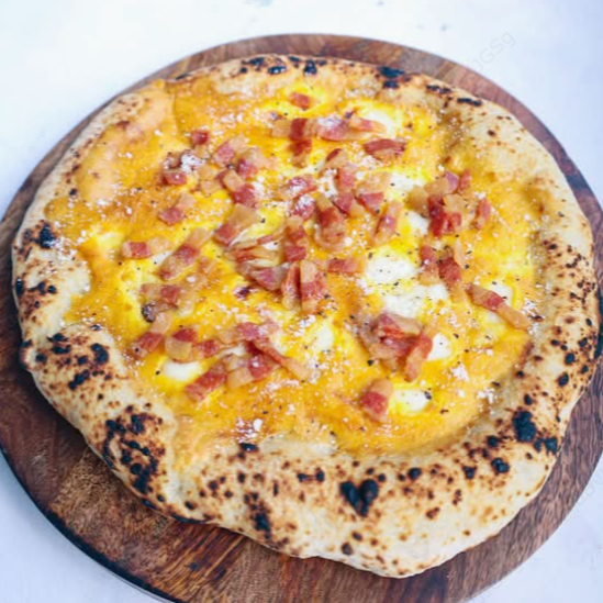 Tocino, salsa carbonara, parmesano, mozzarella y albahaca.