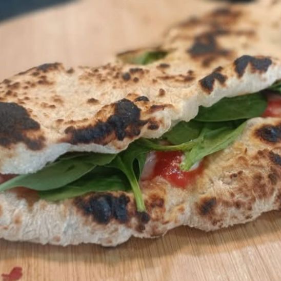 Emparedado recién horneado relleno de mozzarella, salami y arúgula fresca.