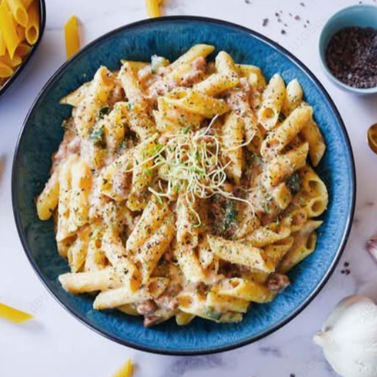 Auténtica receta romana, 150 g de pasta bañada en una cremosa salsa de yema de huevo, queso pecorino romano, pimienta negra recién molida y tocino dorado. ¡Sin crema, sin complicaciones, solo sabor auténtico!