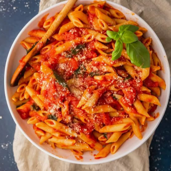 Pasta al dente bañada en la clásica salsa de tomate San Marzano cocinado lentamente con albahaca, ajo y aceite de oliva. ¡Ligera, fragante y llena de sabor casero!