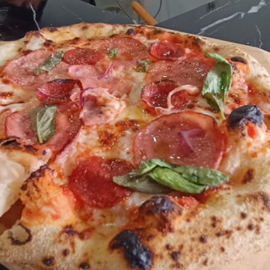 Tomate, pepperoni, cebolla morada, albahaca, salami y mozzarella.