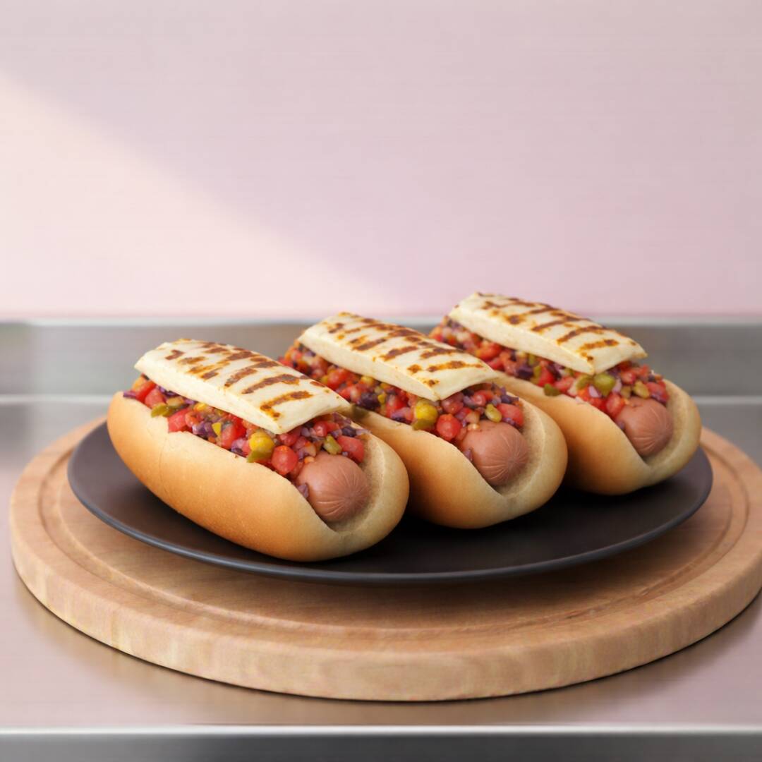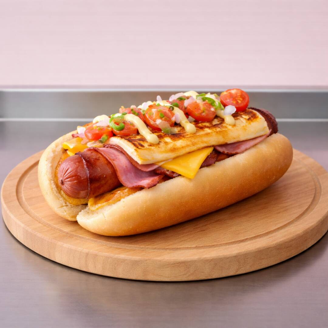 Salchicha dorada a la plancha en pan suave y tostado, acompañada con queso panela fresco que aporta un contraste ligero y delicioso. Complementado con ingredientes clásicos que equilibran cada bocado.