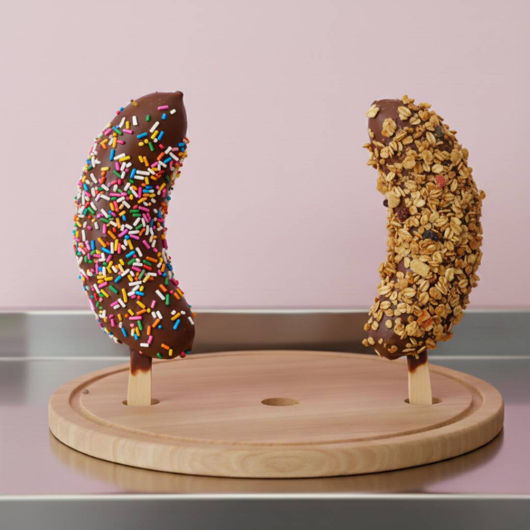 Banana cubierta con chocolate y el topping que tú prefieras. Elige tu favorita: coco rallado, coco tostado, granola o chispitas de colores. Refrescante, crujiente y simplemente irresistible.