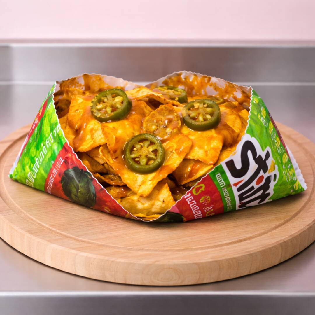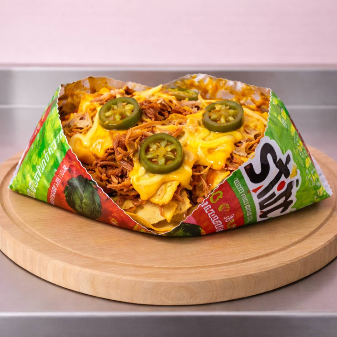 Crujientes Tostitos preparados con jugosa carne de pierna, bañados con queso americano derretido y queso manchego gratinado, coronados con rodajas de chile jalapeño. Una combinación intensa, cremosa y ligeramente picosa que eleva el antojo a otro nivel.