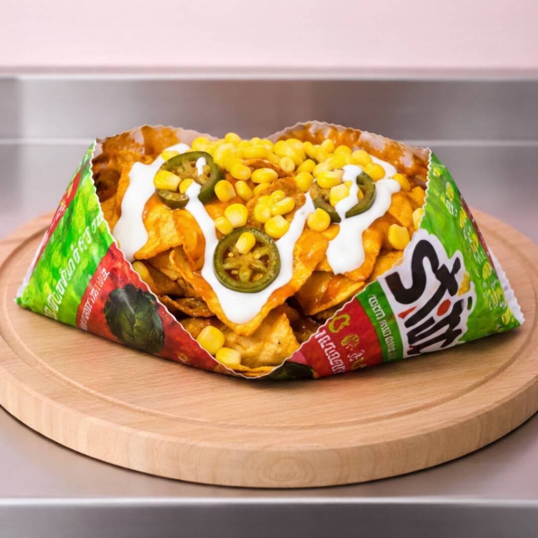 Crujientes tostitos preparados con elote, mayonesa, queso rallado, limón y el toque perfecto de chile en polvo. Una mezcla cremosa, picosita y llena de sabor que convierte cada bocado en puro antojo.