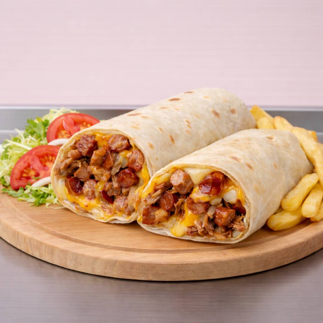 Tortilla de harina grande que envuelve una combinación irresistible: jugosa carne de pierna, salchicha dorada, tocino crujiente, queso Oaxaca fundido y queso amarillo derretido que integra cada ingrediente a la perfección. Acompañado de ensalada tradicional y papas a la francesa.