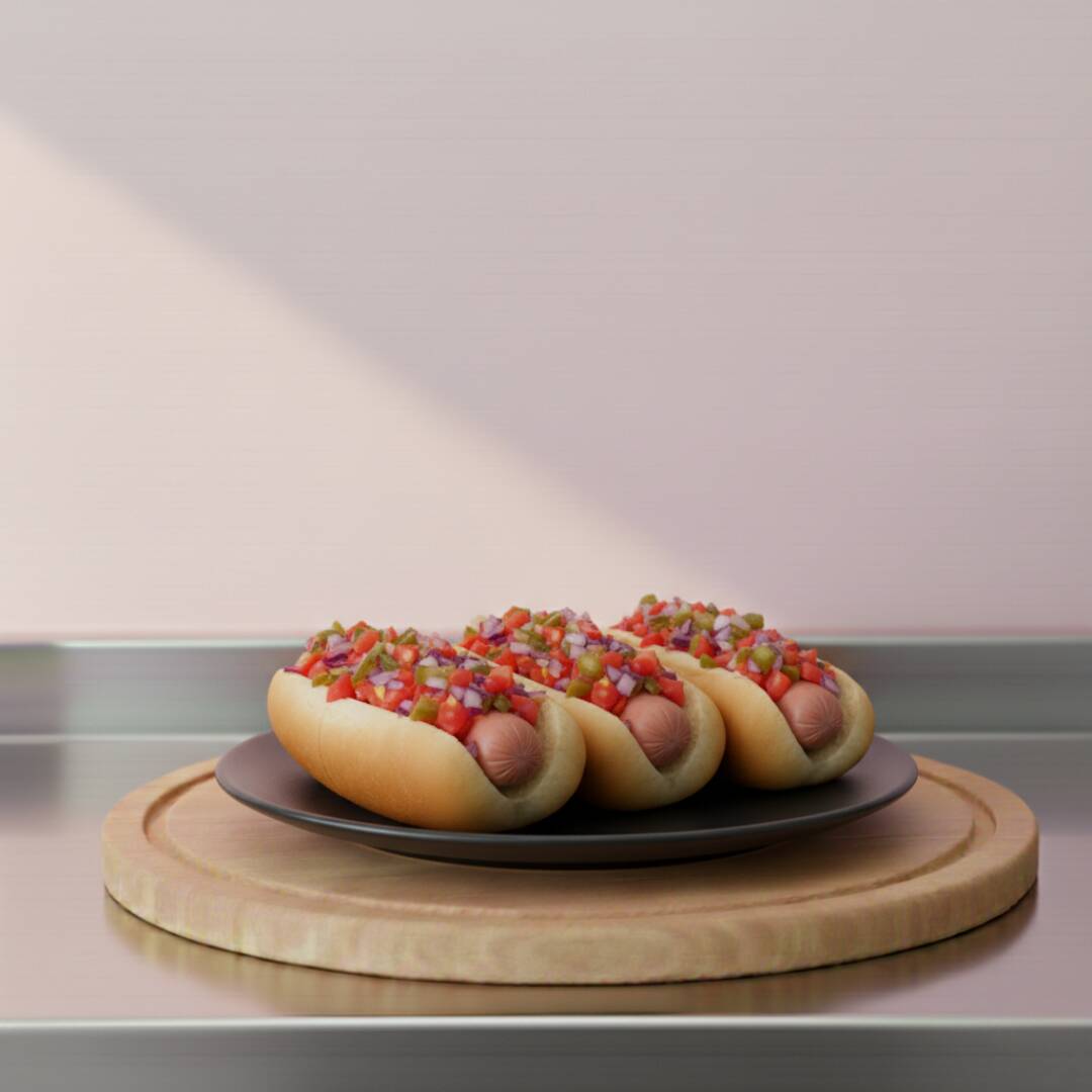 Salchicha dorada a la plancha, servida en pan suave y ligeramente tostado, acompañada de los complementos tradicionales que realzan su sabor en cada mordida.