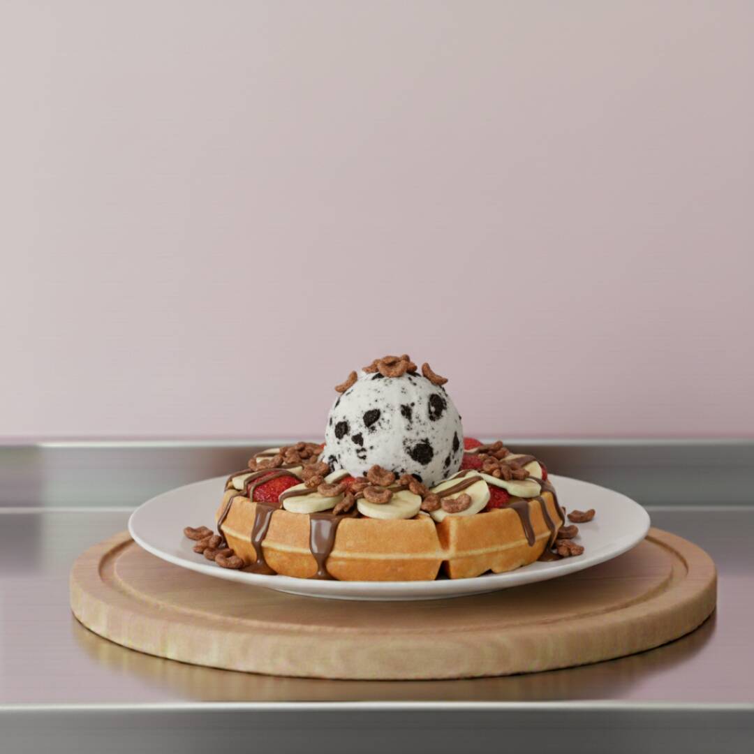 La combinación perfecta: waffle recién hecho, fruta fresca y una bola de nieve cremosa que se derrite al punto ideal. Un antojo irresistible.