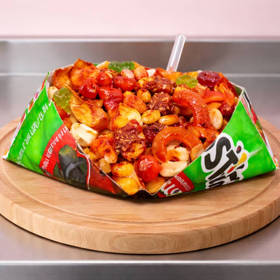 Crujientes Doritos nachos preparados con jícama, pepino, cueritos, cacahuates, gomitas y salsas. Una explosión de sabor entre lo ácido, lo picosito y lo dulce en cada bocado. Perfectos para antojar.