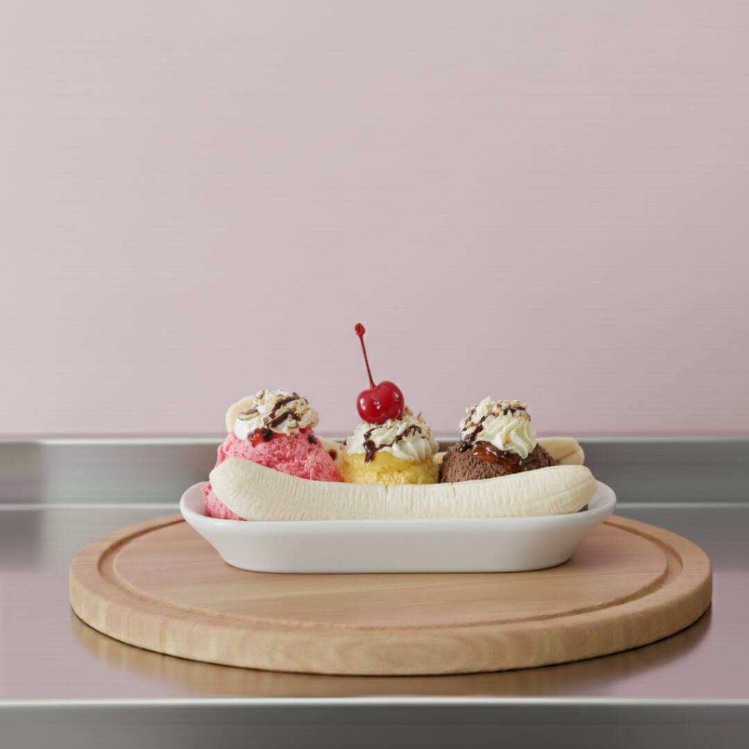 Clásico irresistible con plátano fresco, 3 bolas de helado a elegir con crema batida y cereza. Una combinación perfecta de sabores y texturas que convierte cualquier momento en un verdadero antojo.