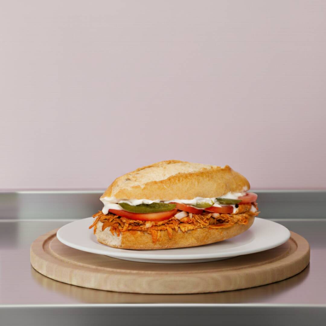 Pan doradito y ligeramente crujiente, relleno de jugosa carne de pierna sazonada a la perfección. Acompañado con ingredientes frescos que realzan su sabor y lo convierten en una opción completa, abundante y llena de carácter.