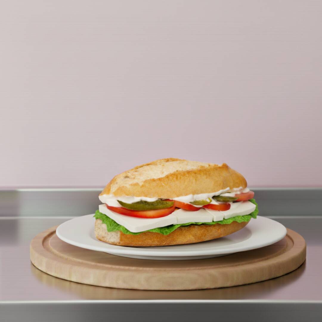 Pan suave y ligeramente tostado, relleno con queso panela fresco y de textura firme, que aporta un sabor delicado y auténtico. Acompañado con ingredientes frescos que realzan su perfil ligero y equilibrado.