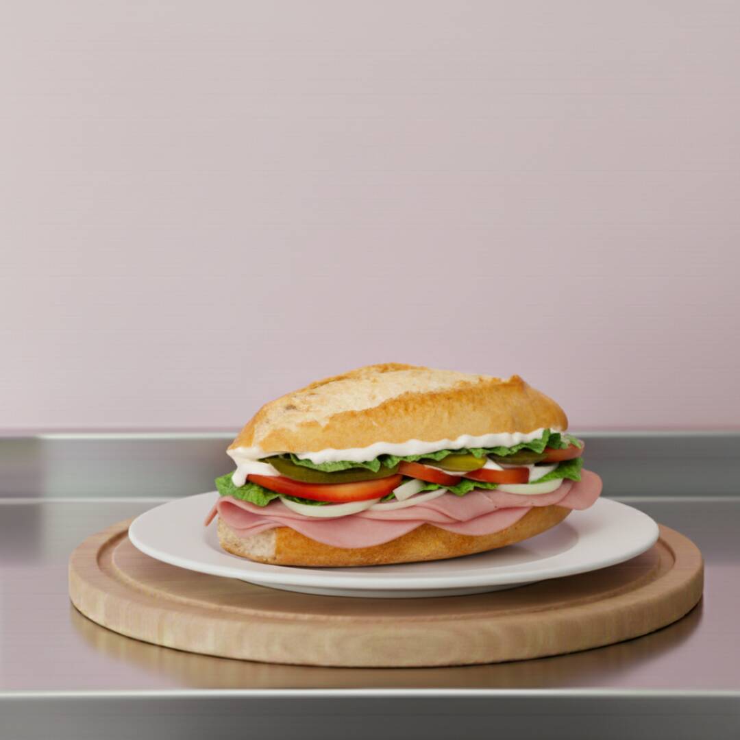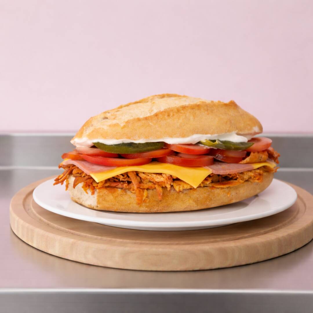 Pan suave y recién dorado, relleno con jamón de calidad y complementado con ingredientes frescos que realzan su sabor. Una combinación equilibrada, ligera y deliciosa que se disfruta en cada mordida.