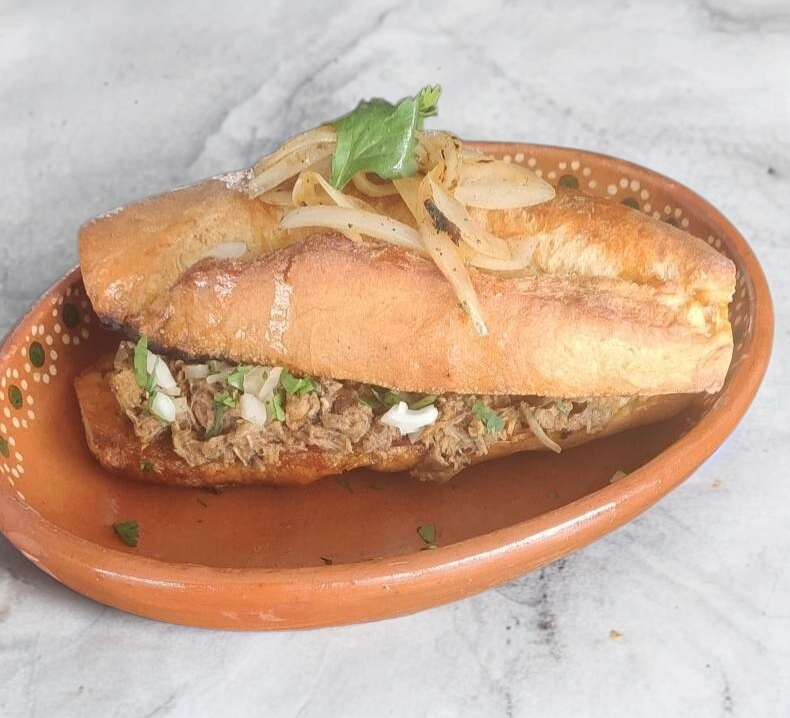 Bolillo dorado en la plancha, con carne de res preparada en barbacoa.