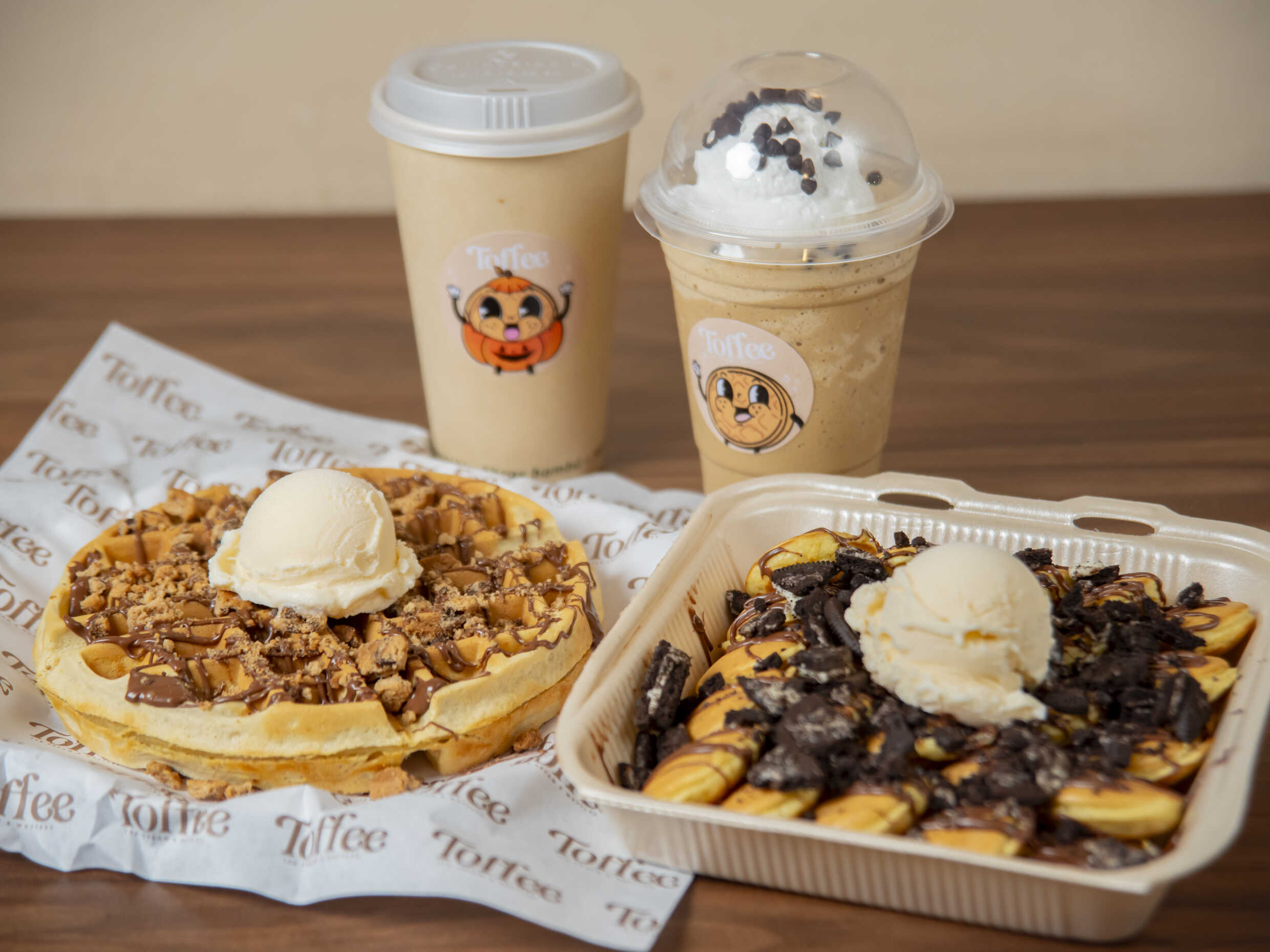 Waffle belga con 3 toppings a elegir y un helado. Mini hotcakes con 3 toppings a elegir y un helado. 2 Bebidas de su elección.