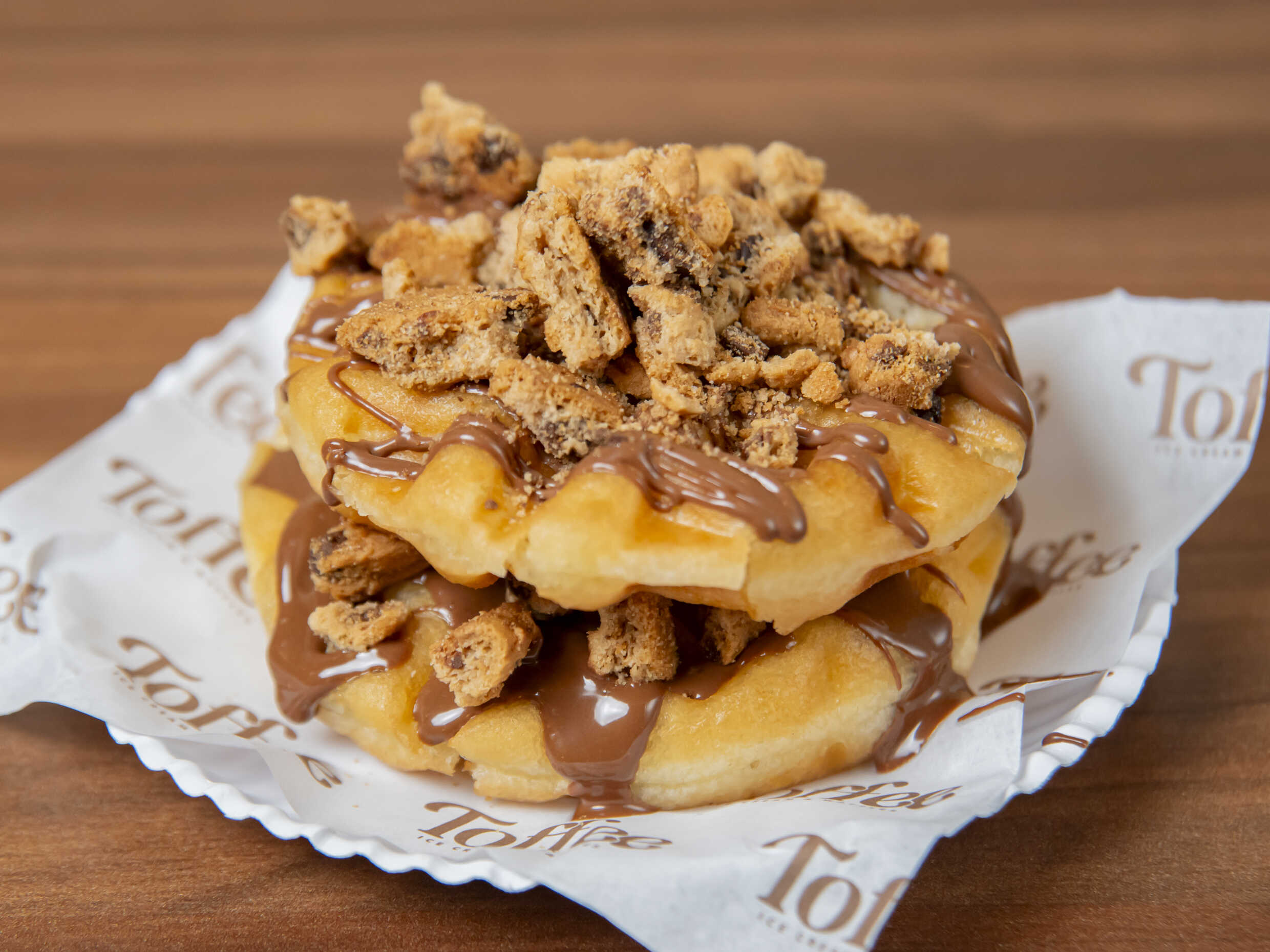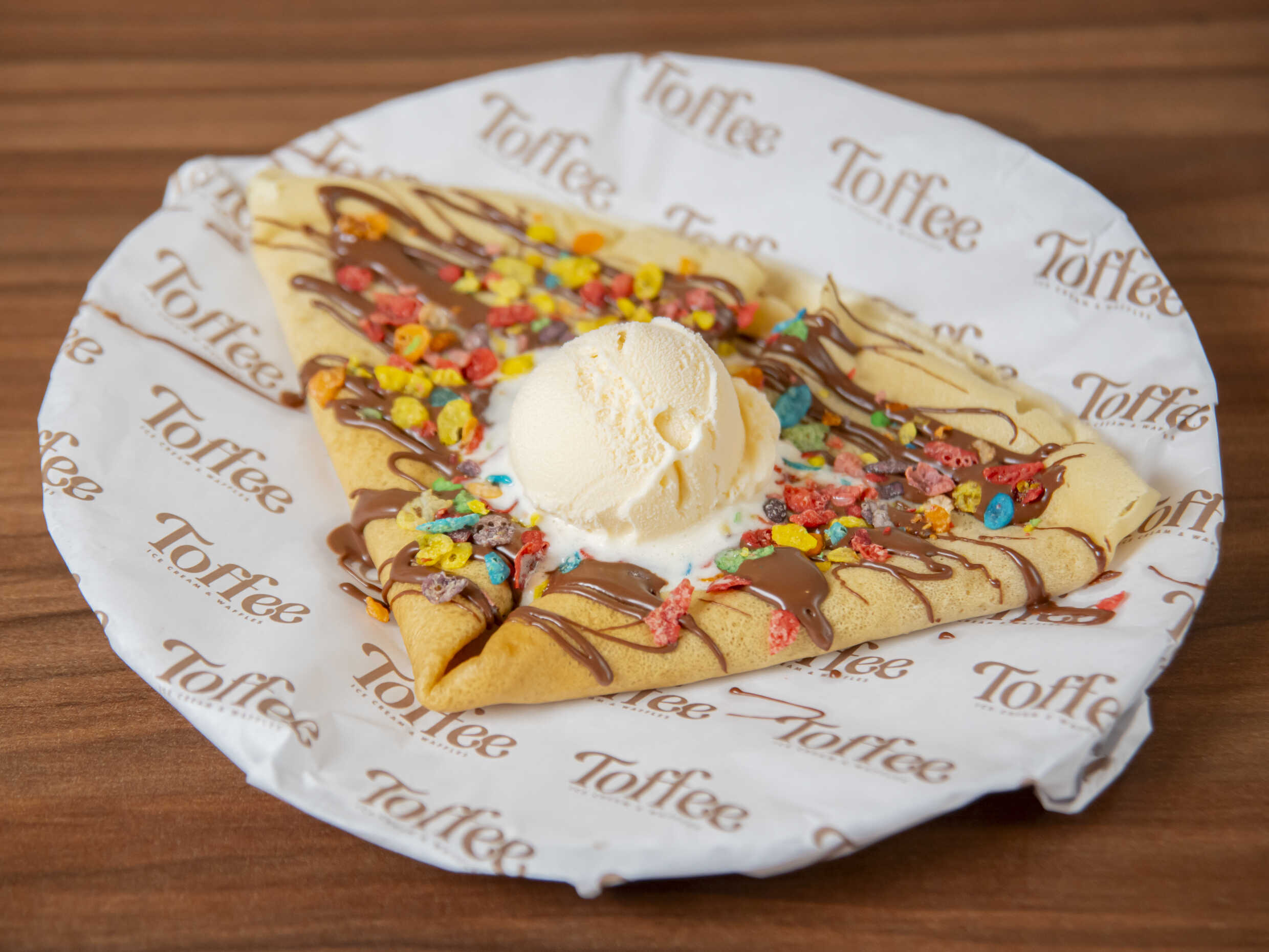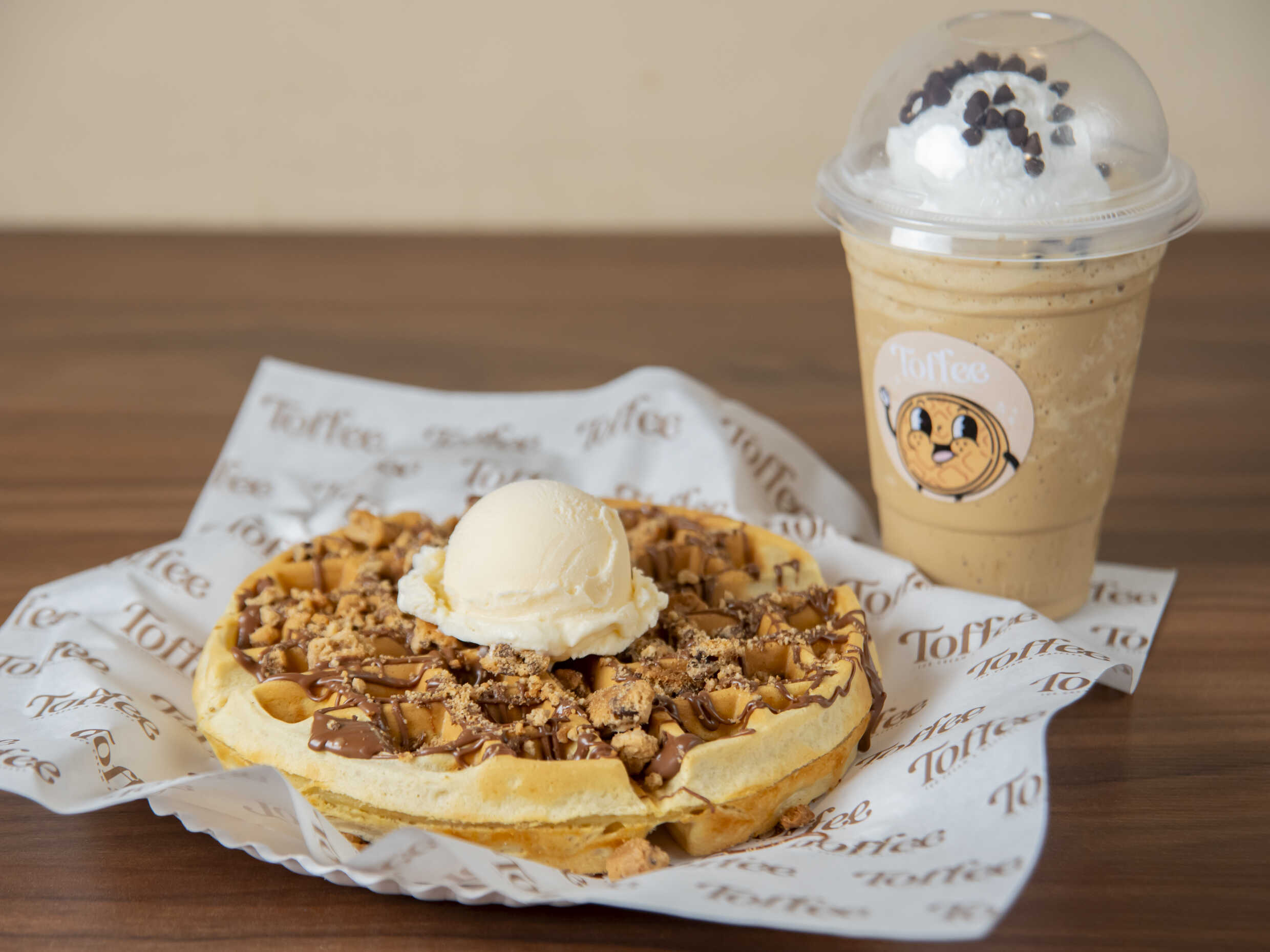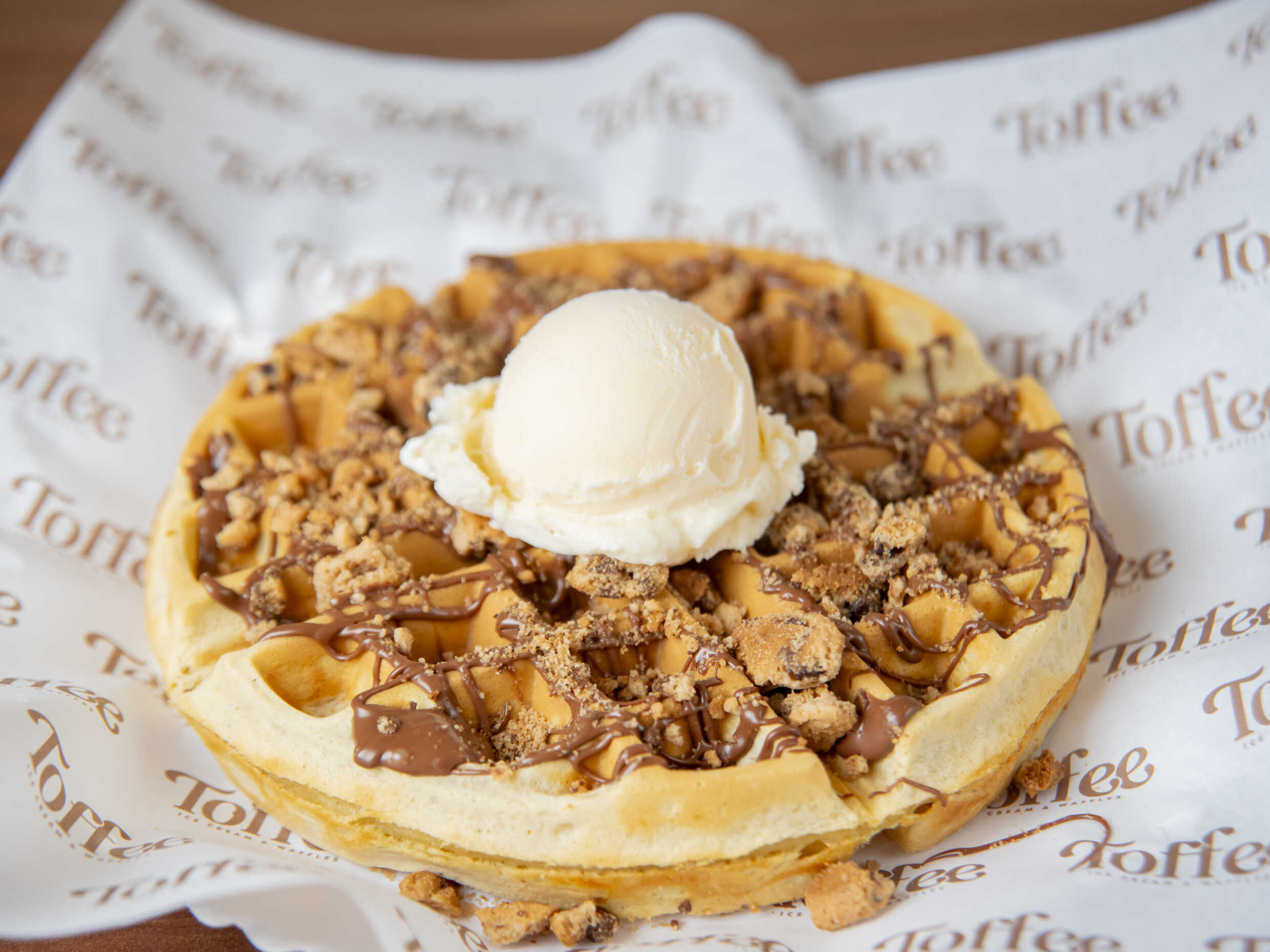Crujiente waffle tradicional sabor vainilla y sin relleno, con helado (empacado aparte) y toppings encima.