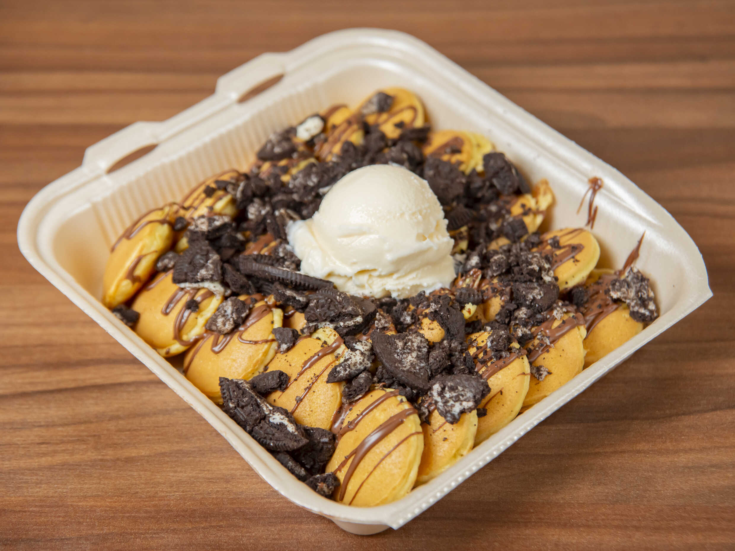 Cajita de 25 mini hotcakes sabor vainilla, con o sin relleno de chocolate, preparados con helado (empacado aparte) y toppings a tu elección.