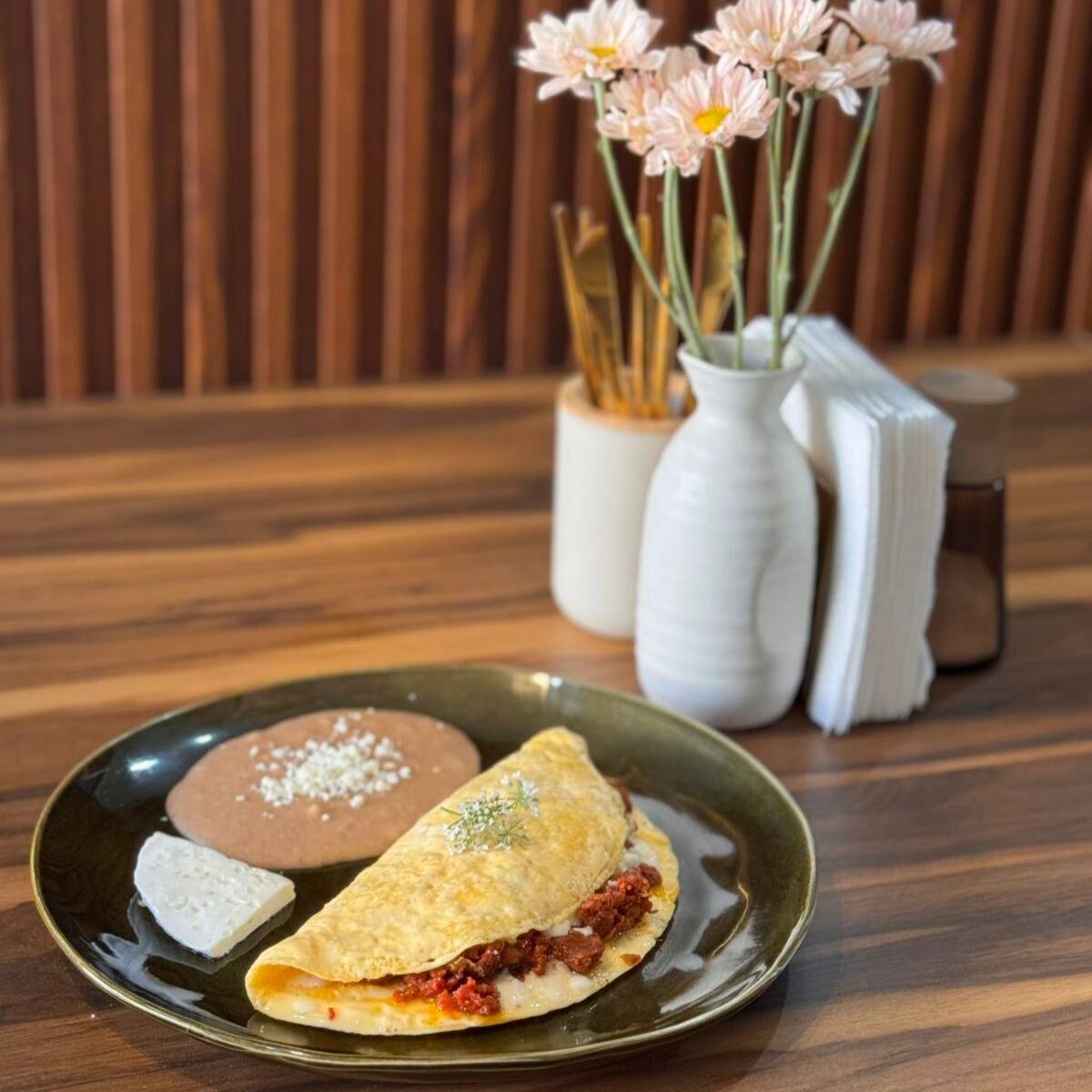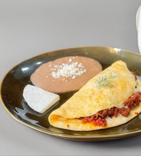 2pz de huevo, relleno de fajitas de arrachera (100g) con champiñón, pimientos y queso oaxaca, acompañado de frijoles y panela.