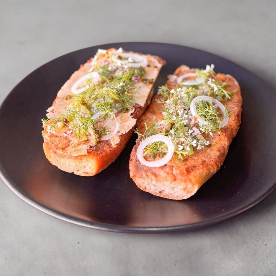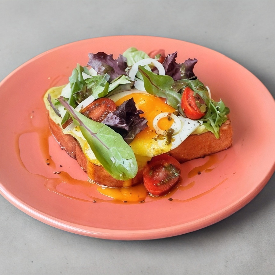 1pz de crujiente hogaza de masa madre untada con mousse de aguacate, 1pz de huevito, mix de lechugas, jitomate cherry, cebolla, pepino y chimichurri.
