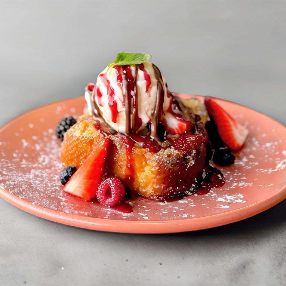 2 rebanadas de pan brioche espolvoreadas con una mezcla de azúcar y canela, decorado con frutos rojos, nutella y azúcar glass.