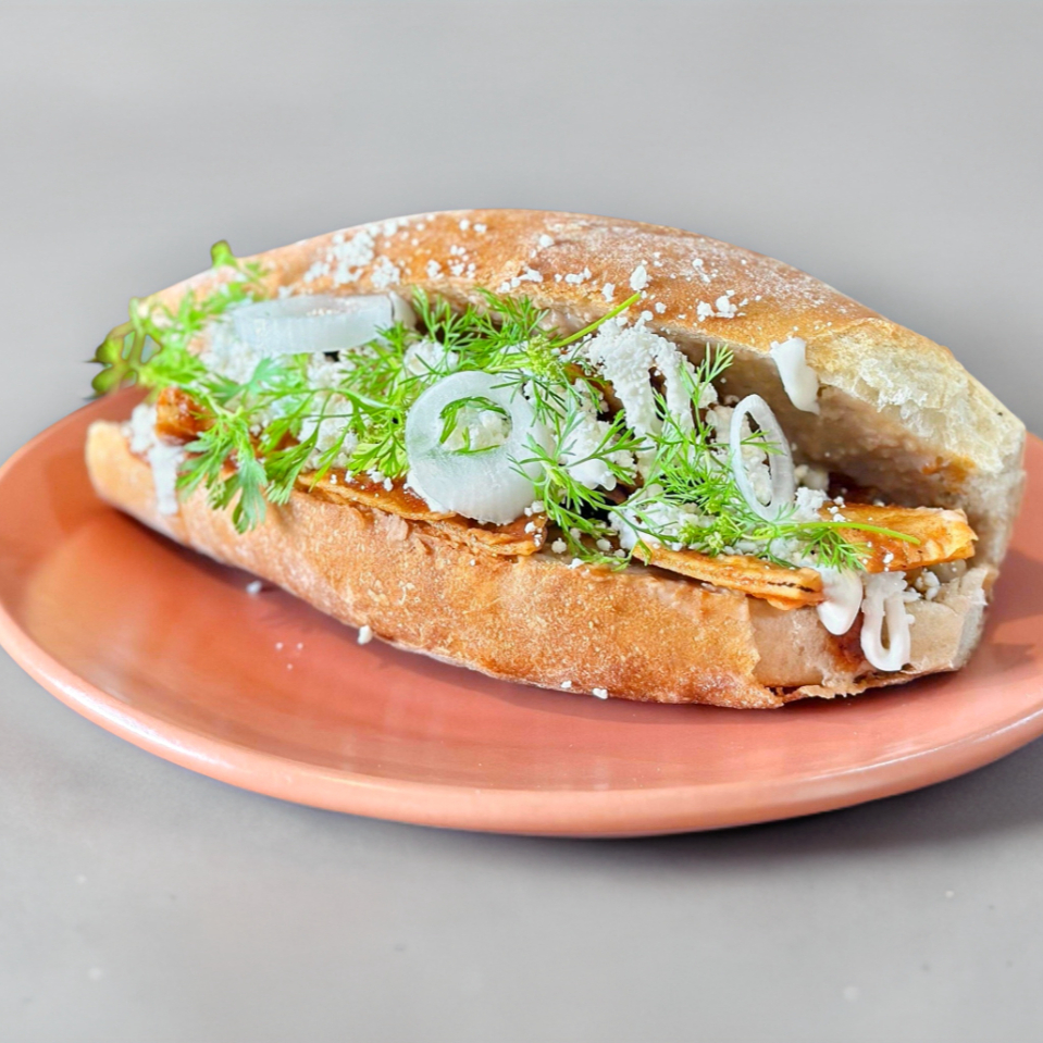 1pz de birote untado con frijoles con una costra de queso adobera, acompañados de pico de gallo de tomatillo.