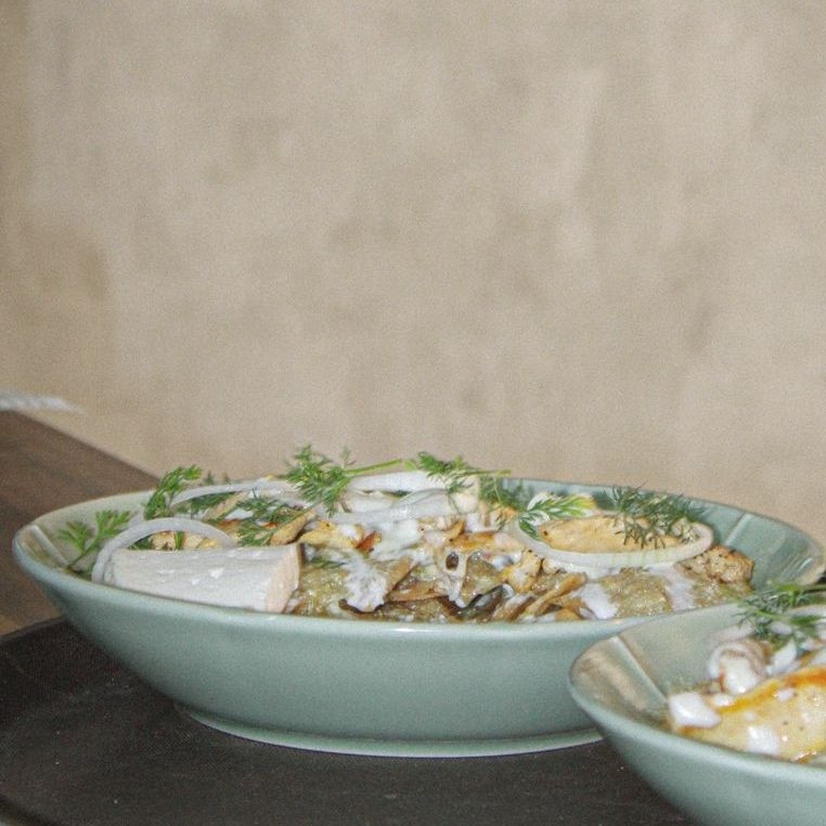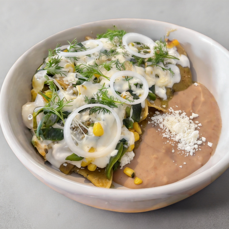 100g de crujientes totopos bañados en salsa verde servidos con crema y pollo (100g) gratinado con queso oaxaca, acompañados de frijoles y panela, decorados con cebolla y cilantro.