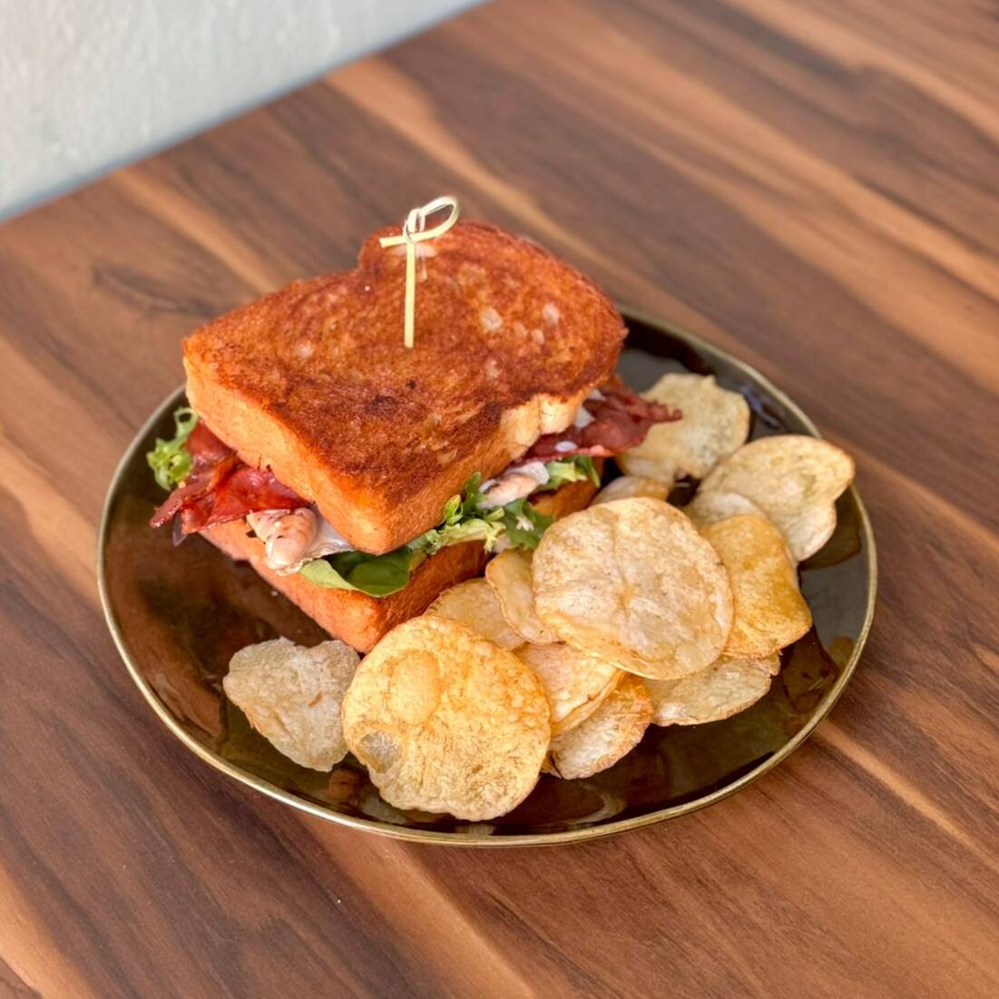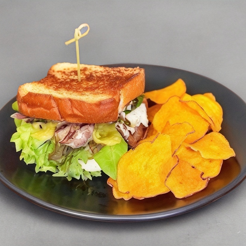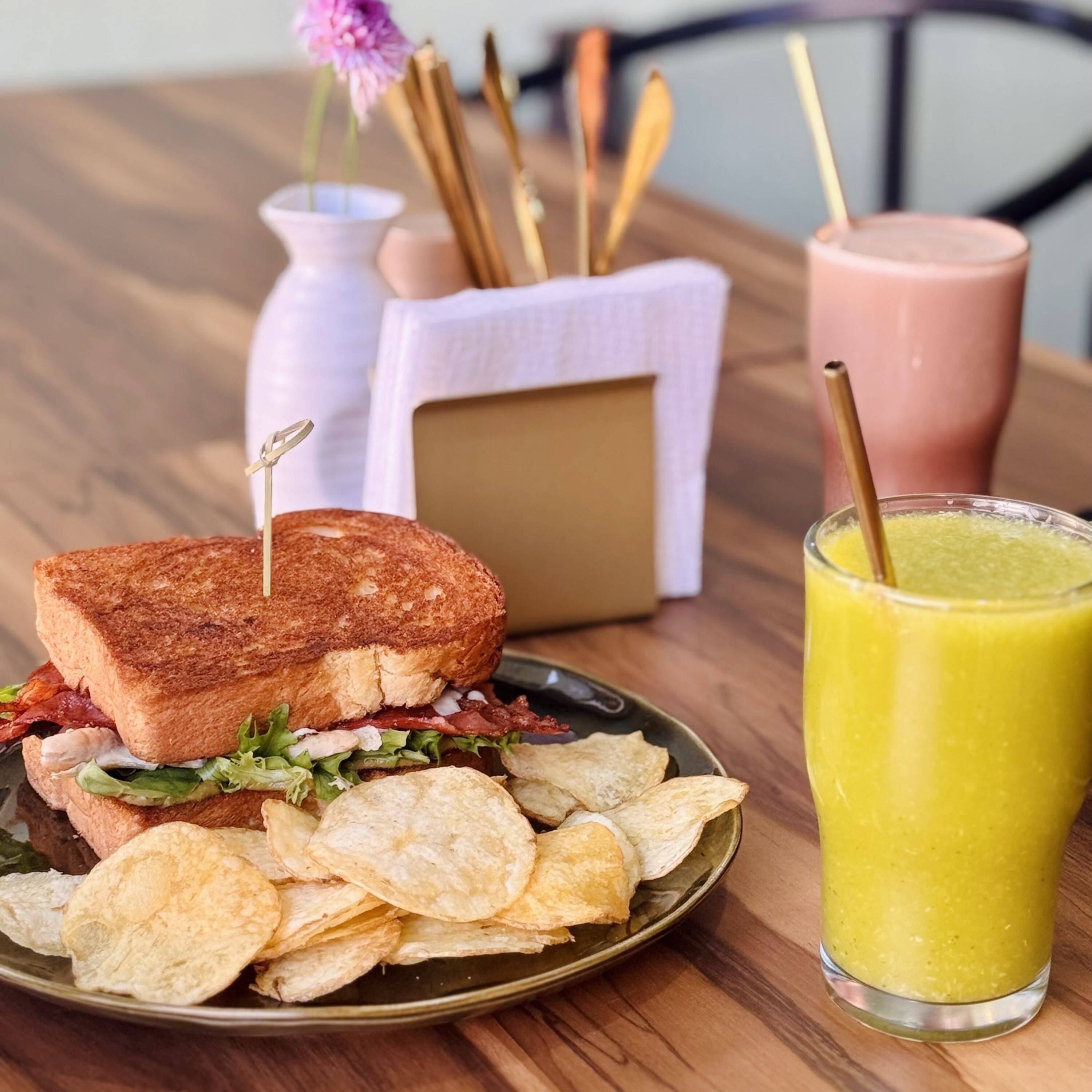 2pz de pan brioche doradito con mantequilla, 100g de pollo a la plancha con crujiente tocino, aguacate y quesito oaxaca, acompañado de chips naturales.